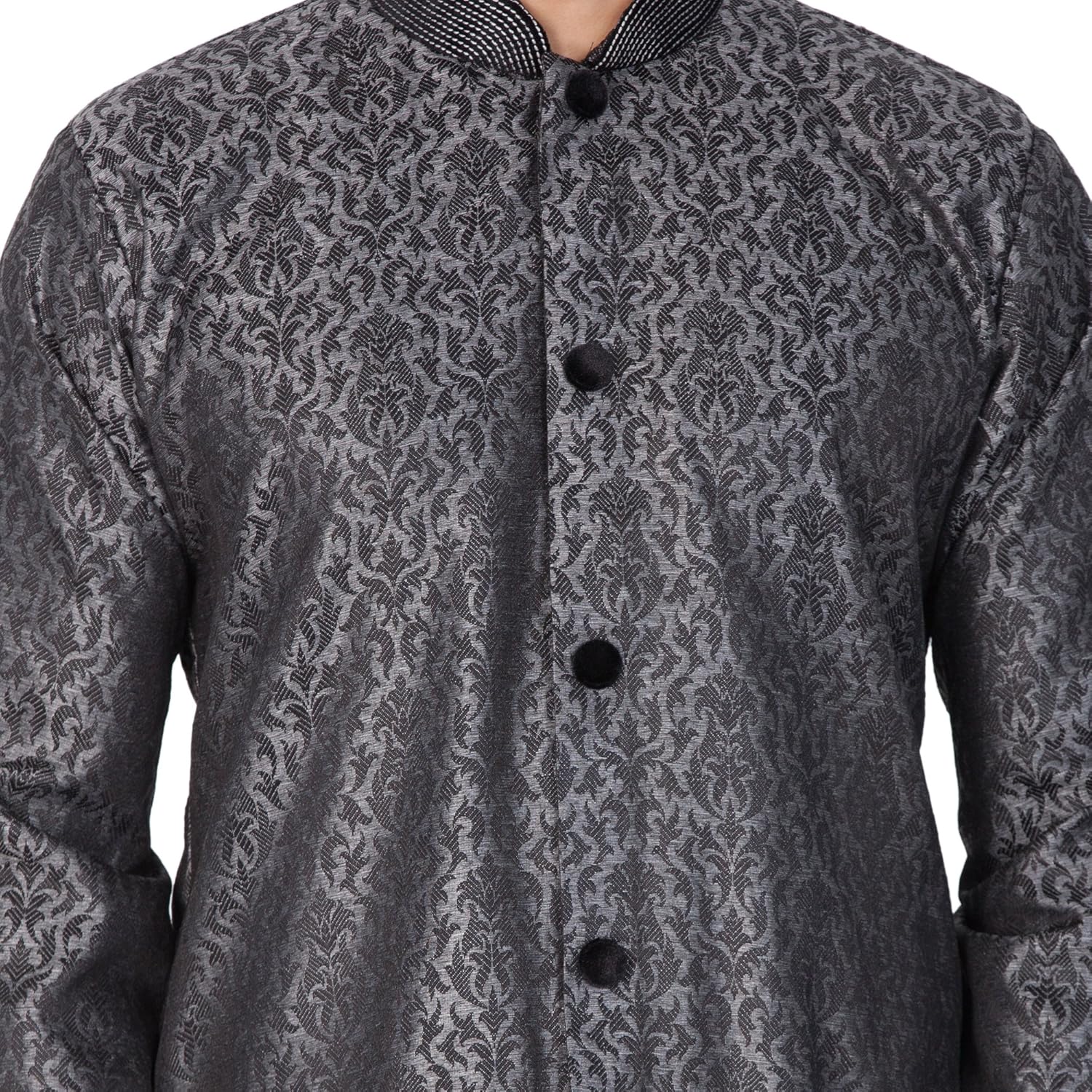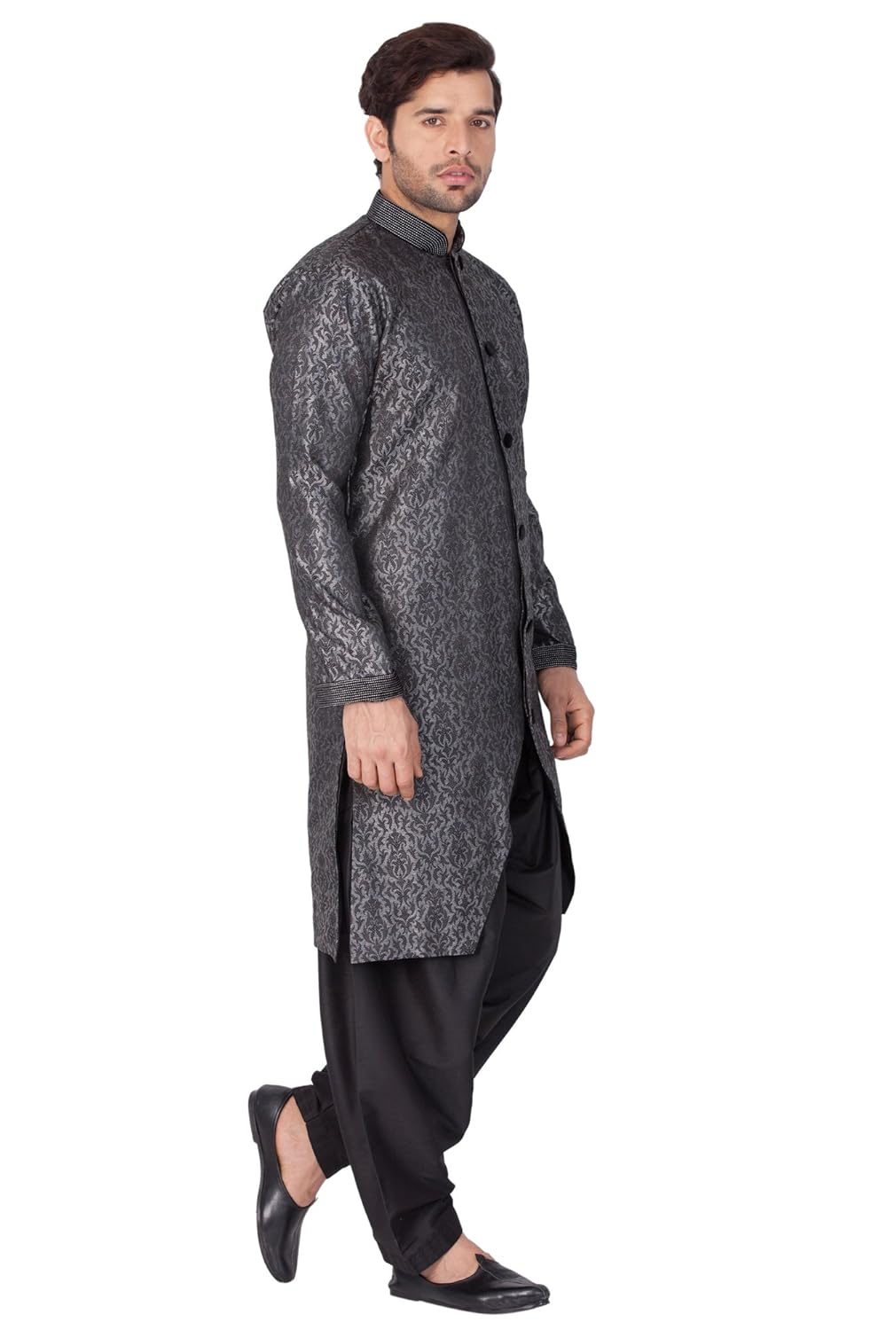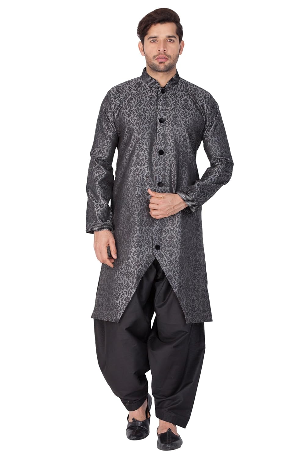 Vastramay brings to you this Stylish yet Comfortable Men Grey Men Indowestern Style Sherwani With Cowl Style Patiala Dhoti Pant Set. Adorn it for a perfect Classy & Trendy look. Pair it with a juti or a mojari for the Royal feel. |