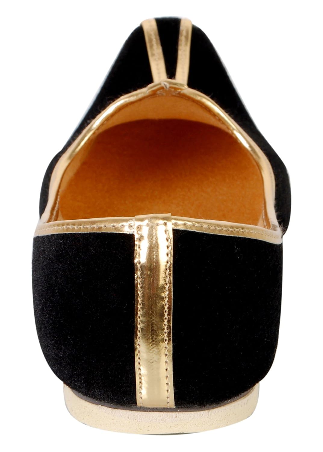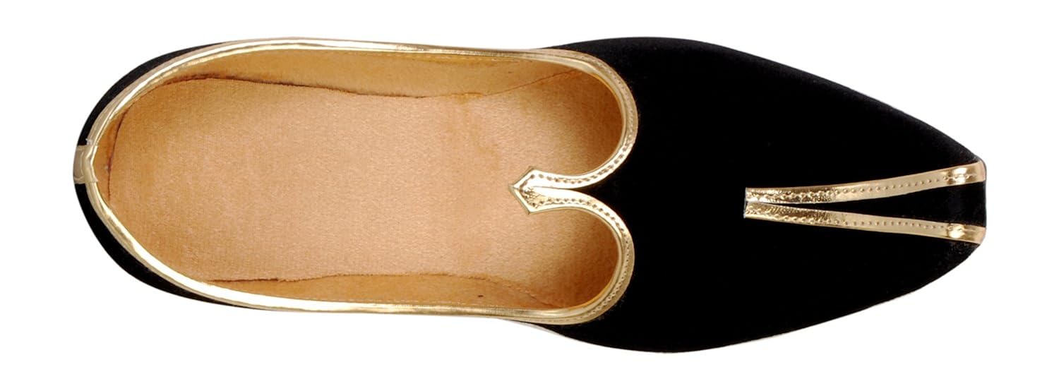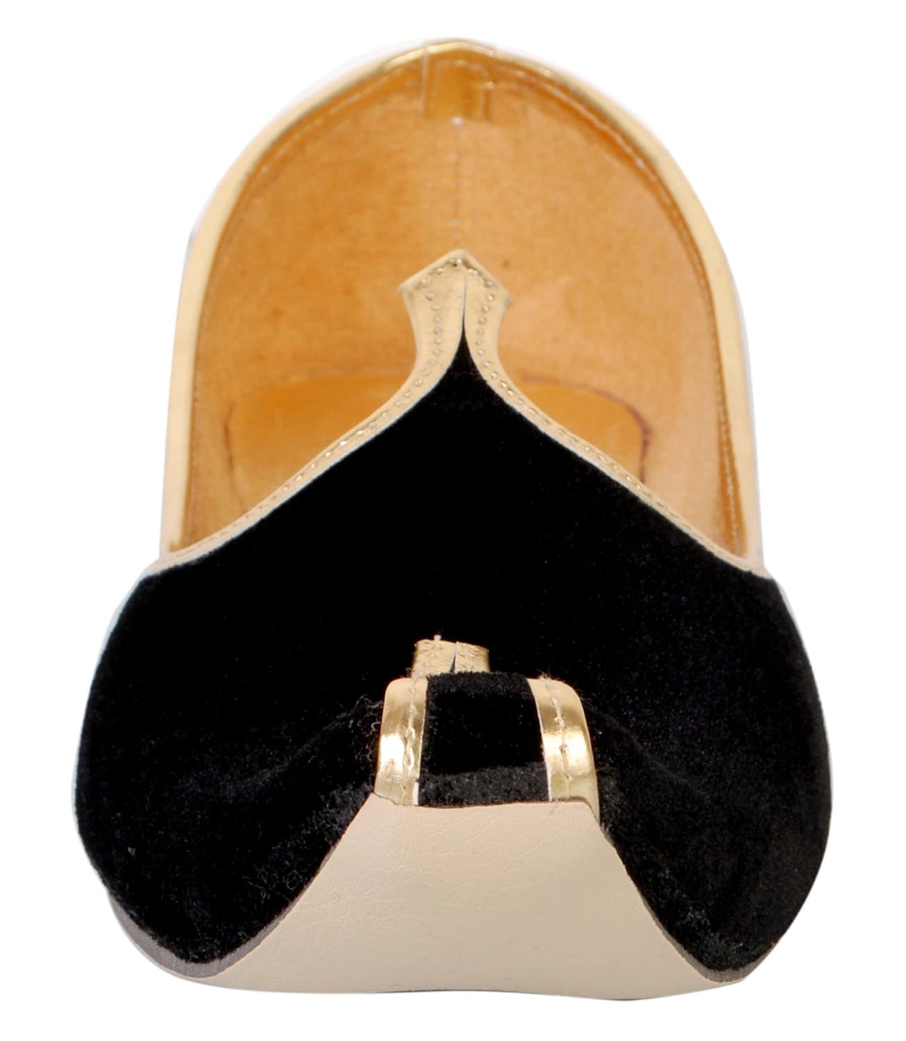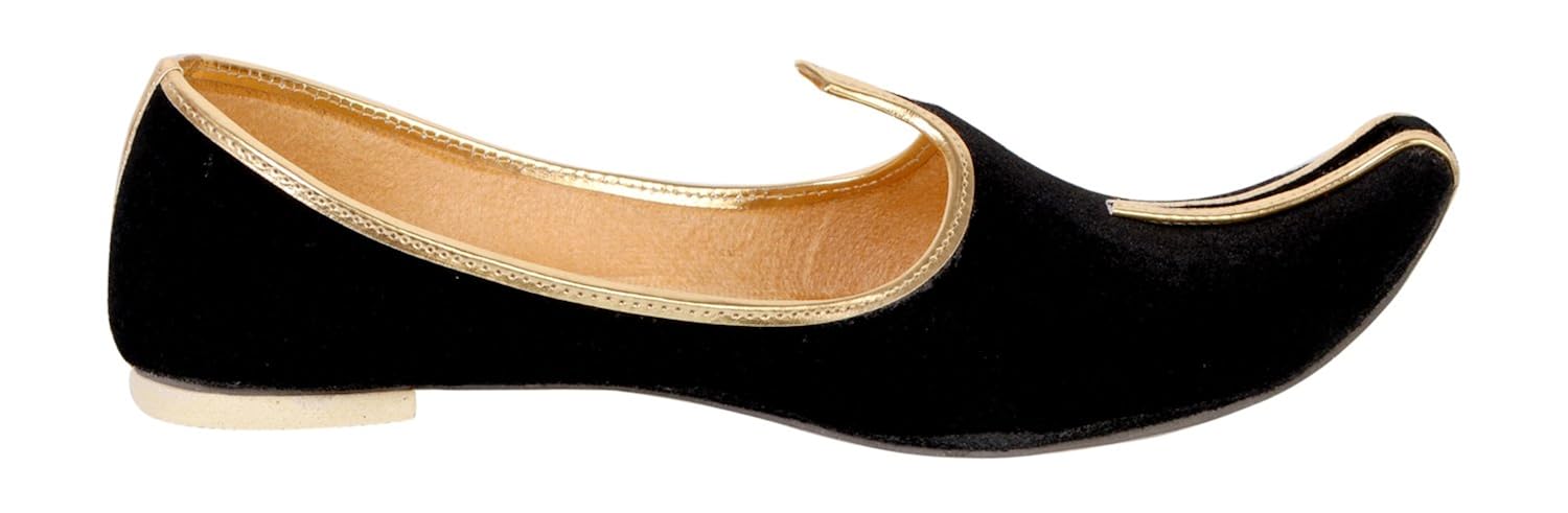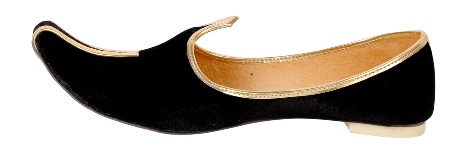 This product is made from velvet on the outside and synthetic material on the inside and is finished in an attractive black color. It features rubber sole, slip on closure, and are designed to be used as traditional wear footwear. Furthermore, it is recommended to be kept away from extreme heat and corrosive liquids to avoid damage. |