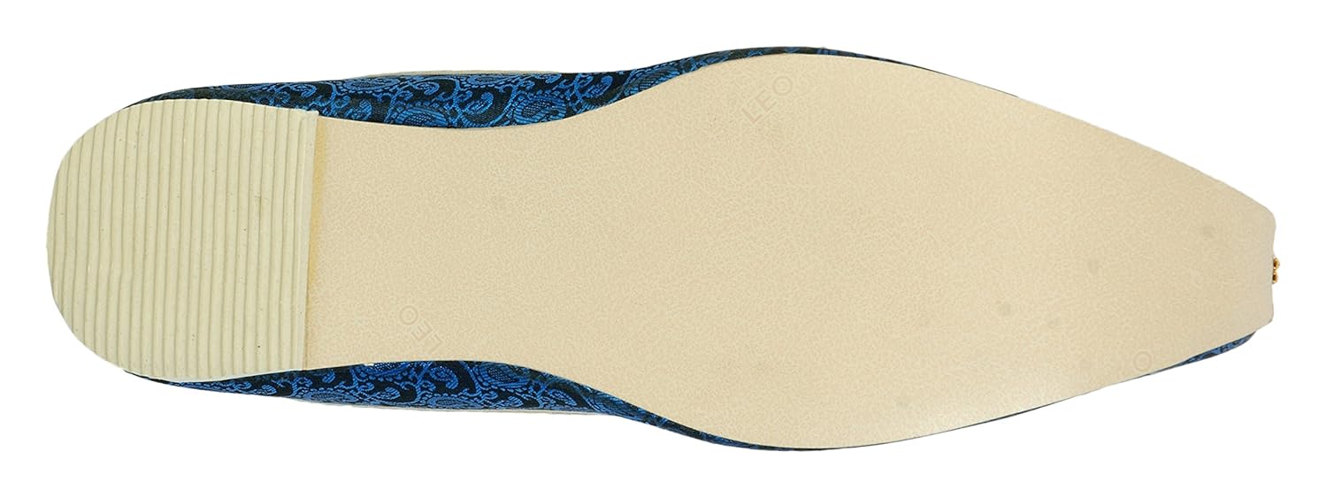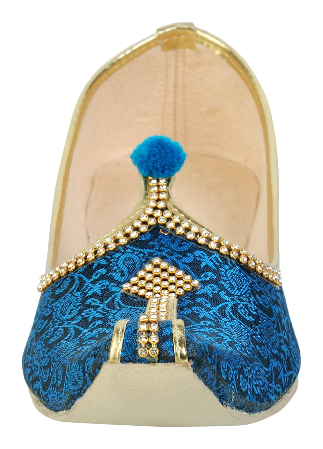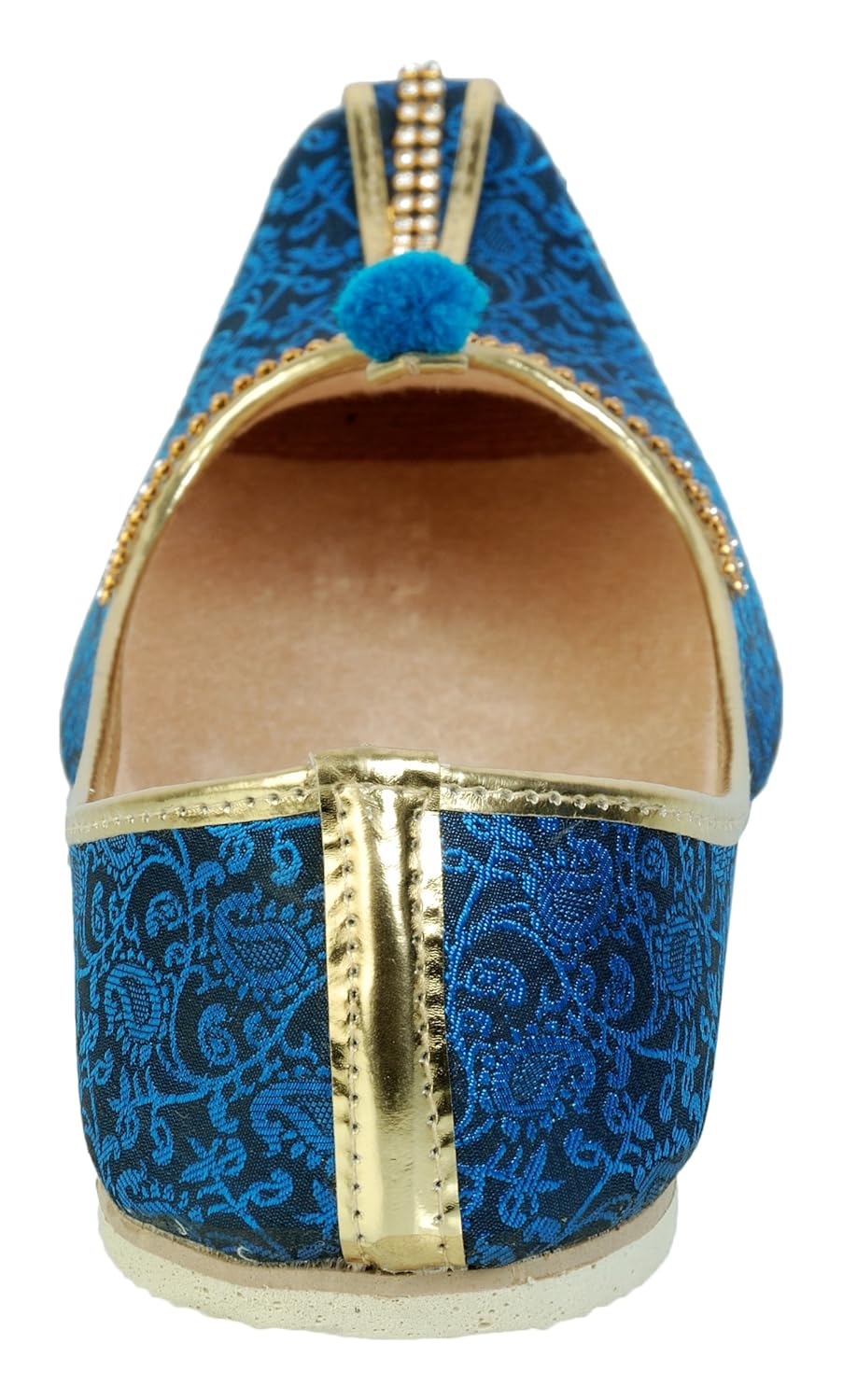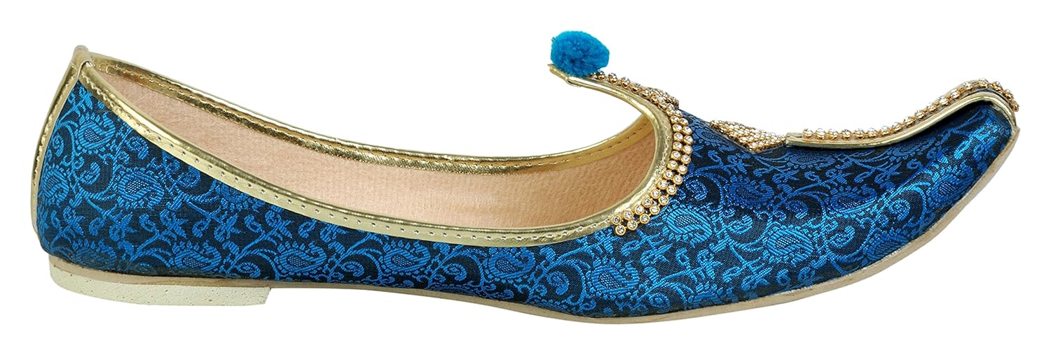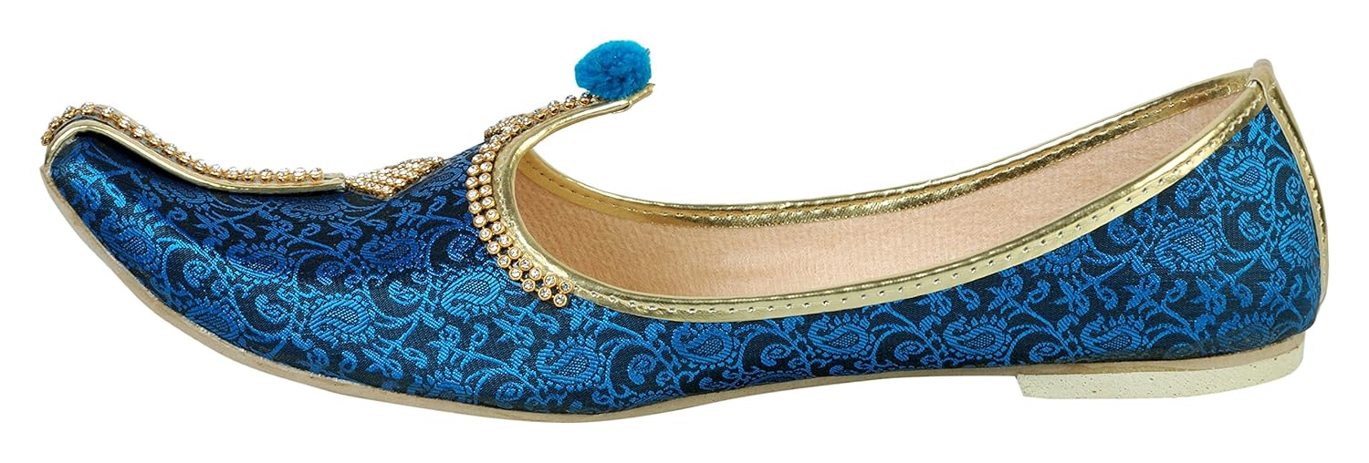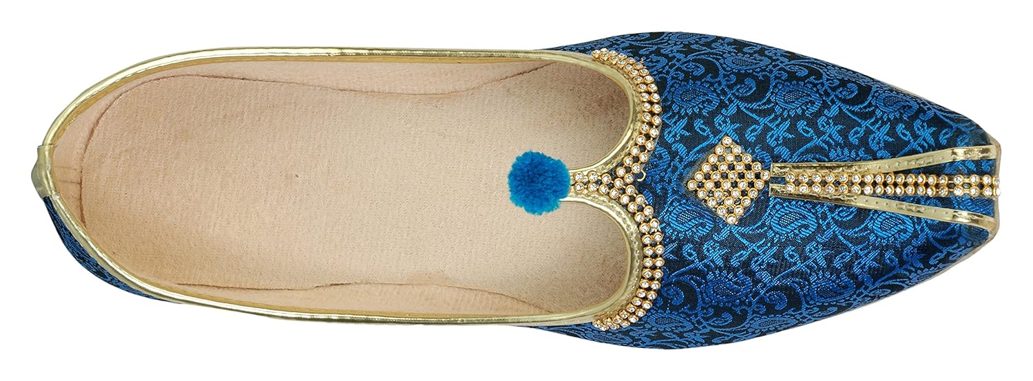 This product is made from synthetic and velvet on the outside and synthetic material on the inside and is finished in an attractive blue color. It features rubber sole, slip on closure, and are designed to be used as traditional wear footwear. Furthermore, it is recommended to be kept away from extreme heat and corrosive liquids to avoid damage. |