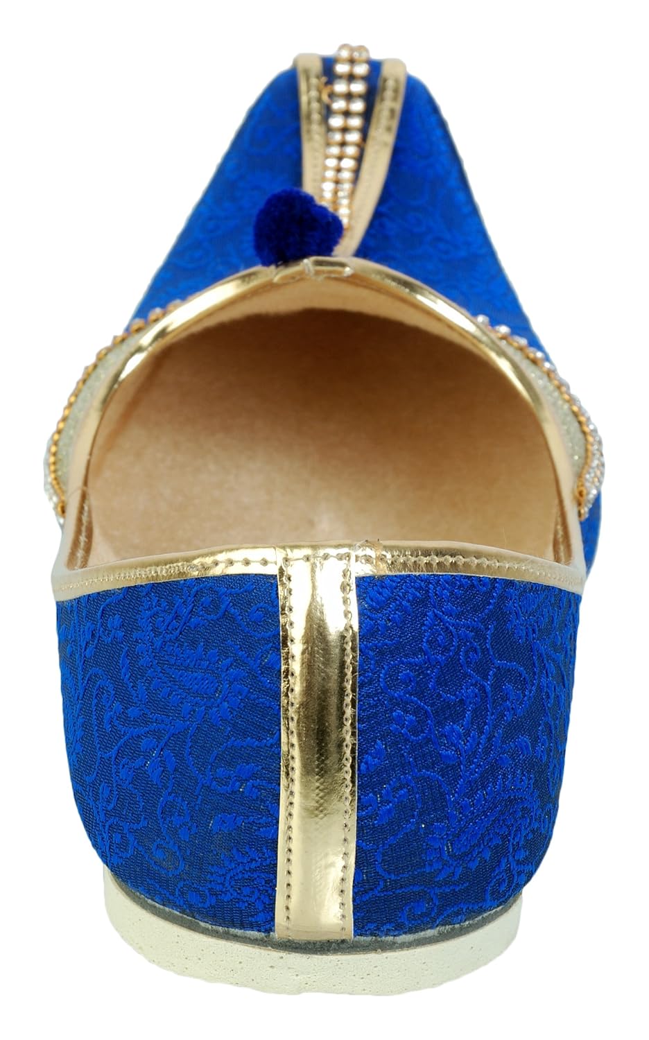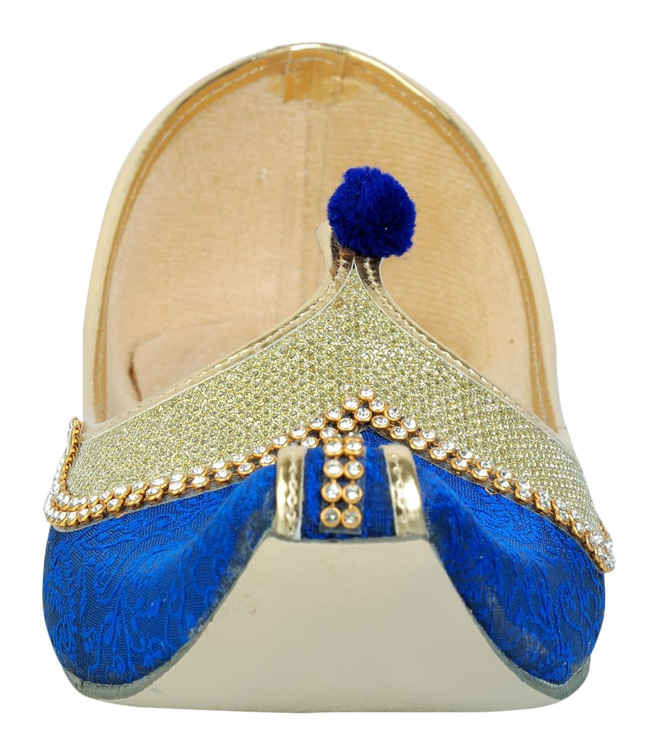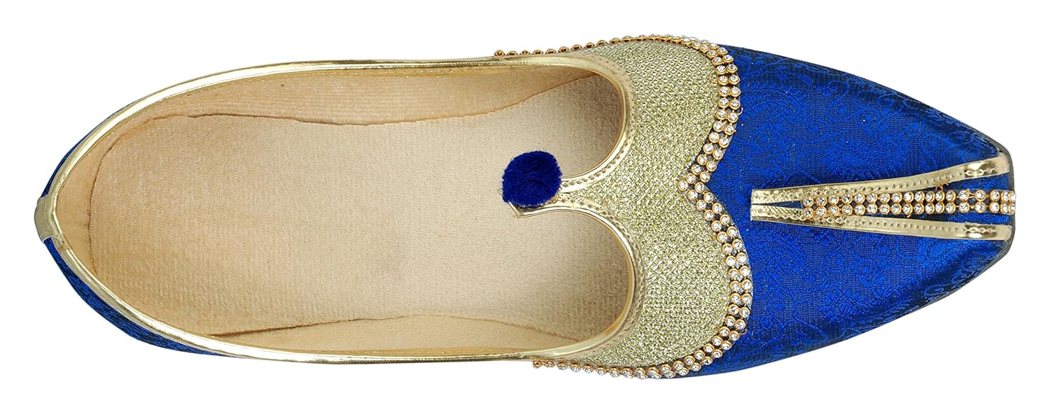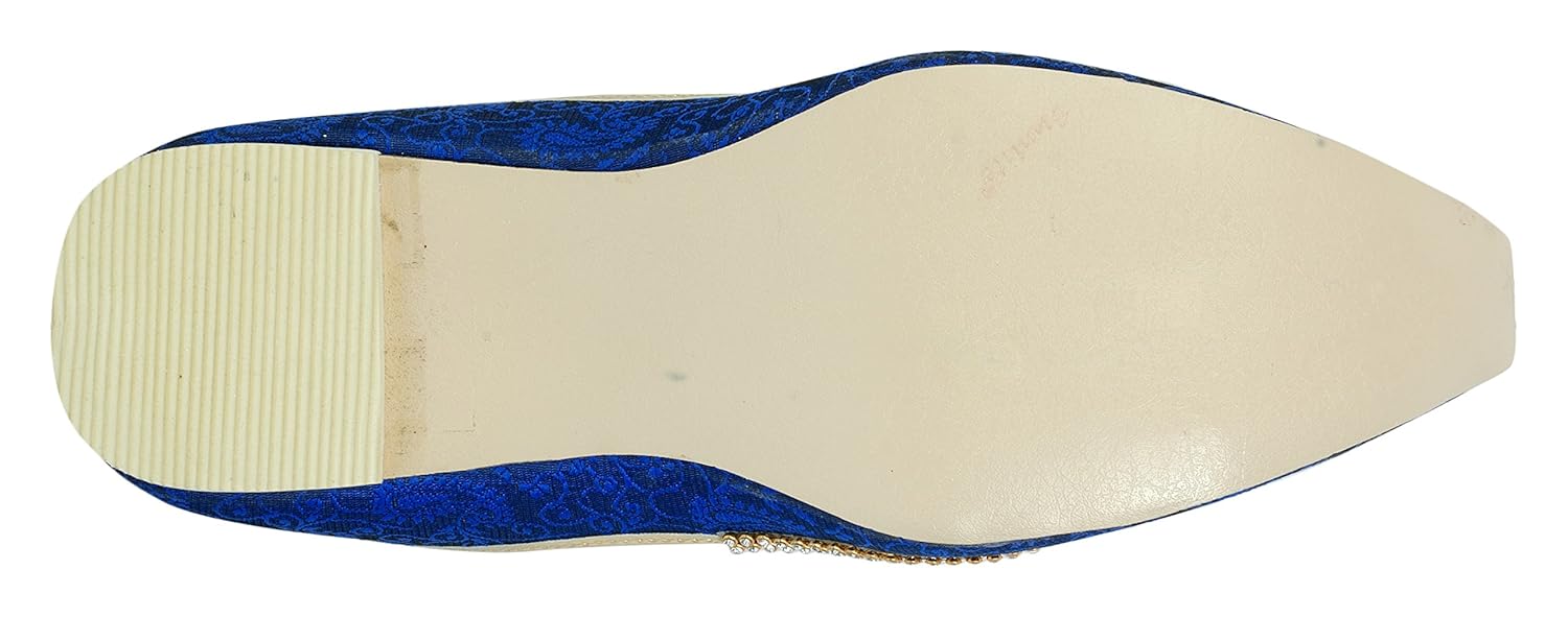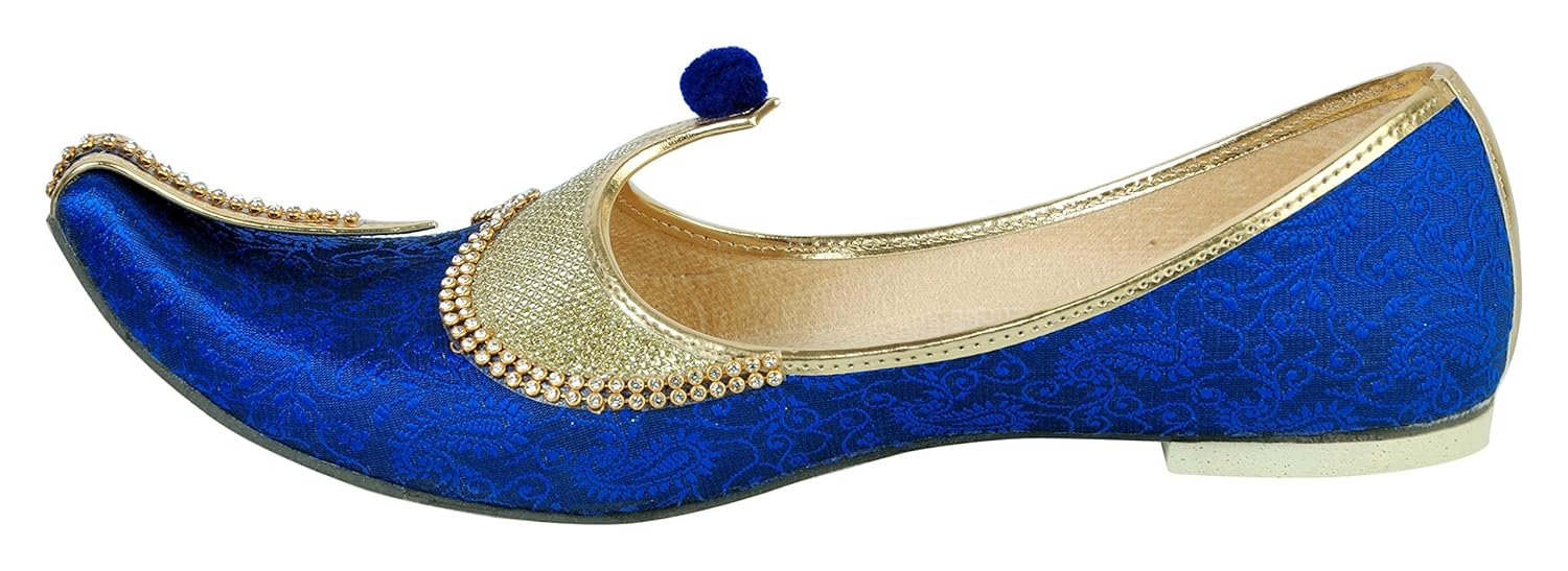 This product is made from synthetic and velvet on the outside and synthetic material on the inside and is finished in an attractive blue color. It features rubber sole, slip on closure, and are designed to be used as traditional wear footwear. Furthermore, it is recommended to be kept away from extreme heat and corrosive liquids to avoid damage. |