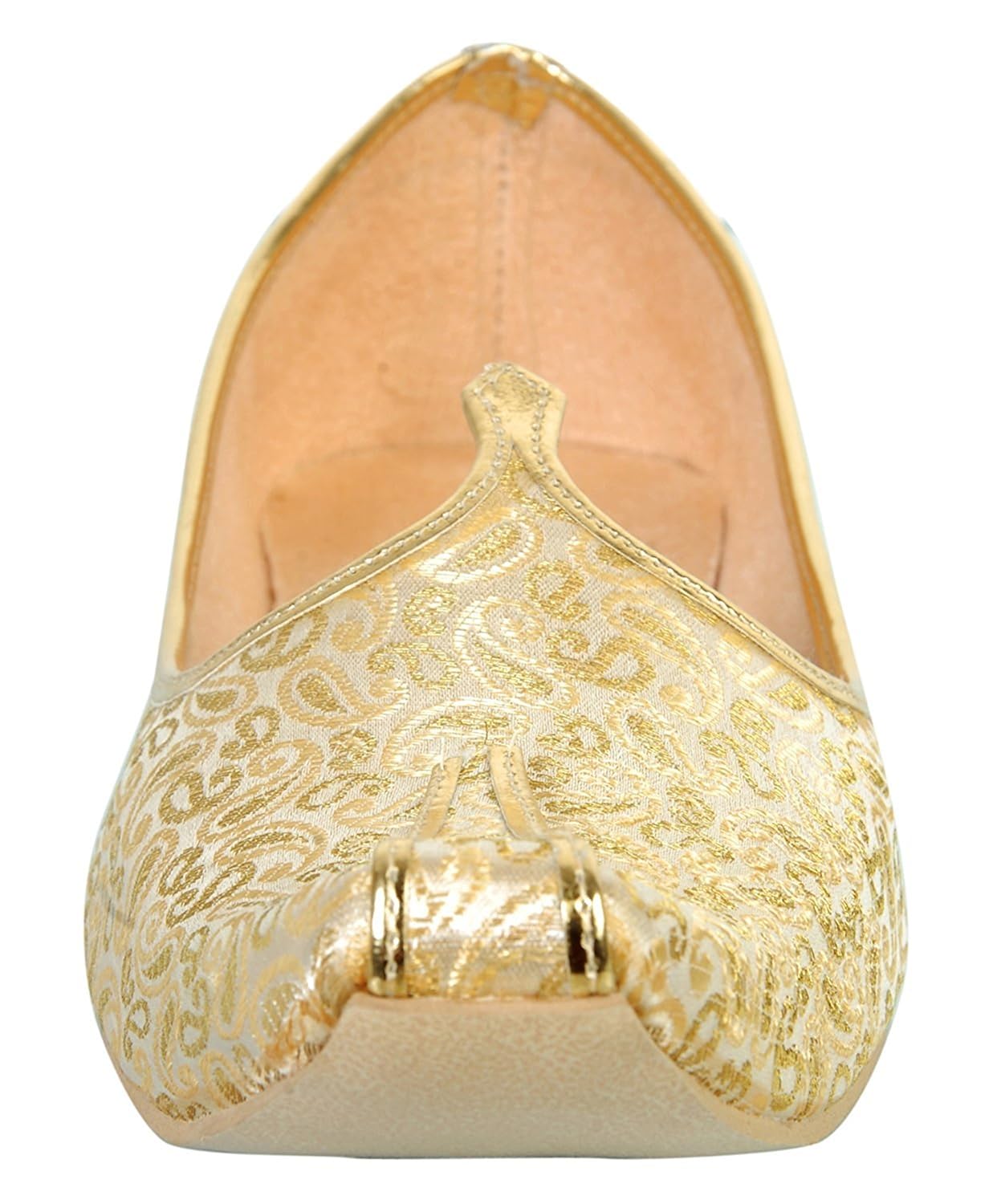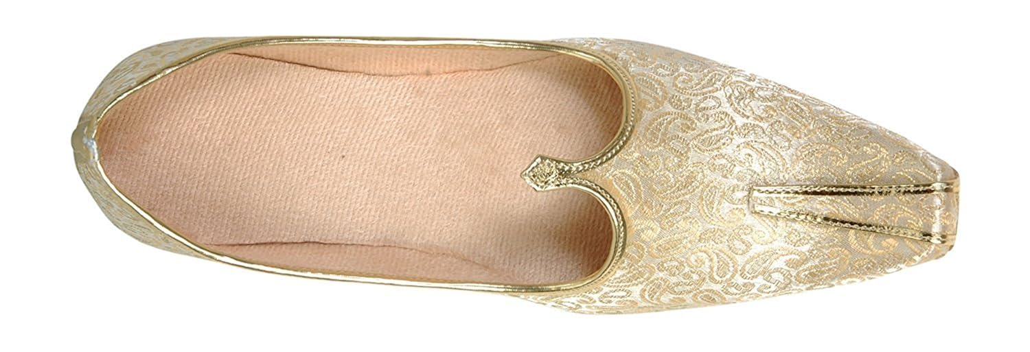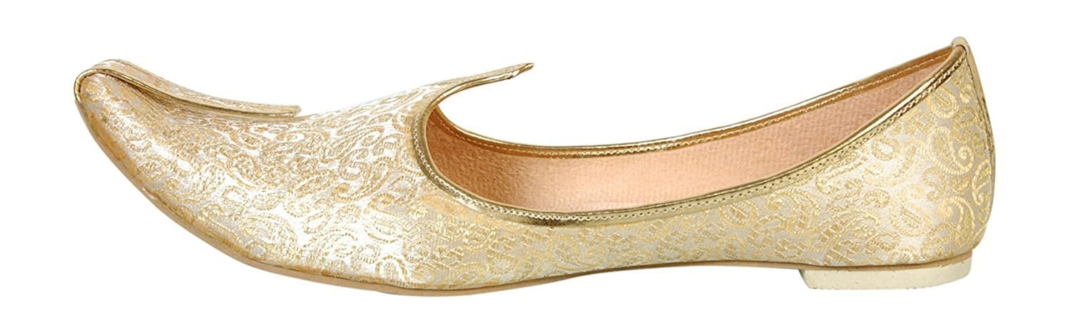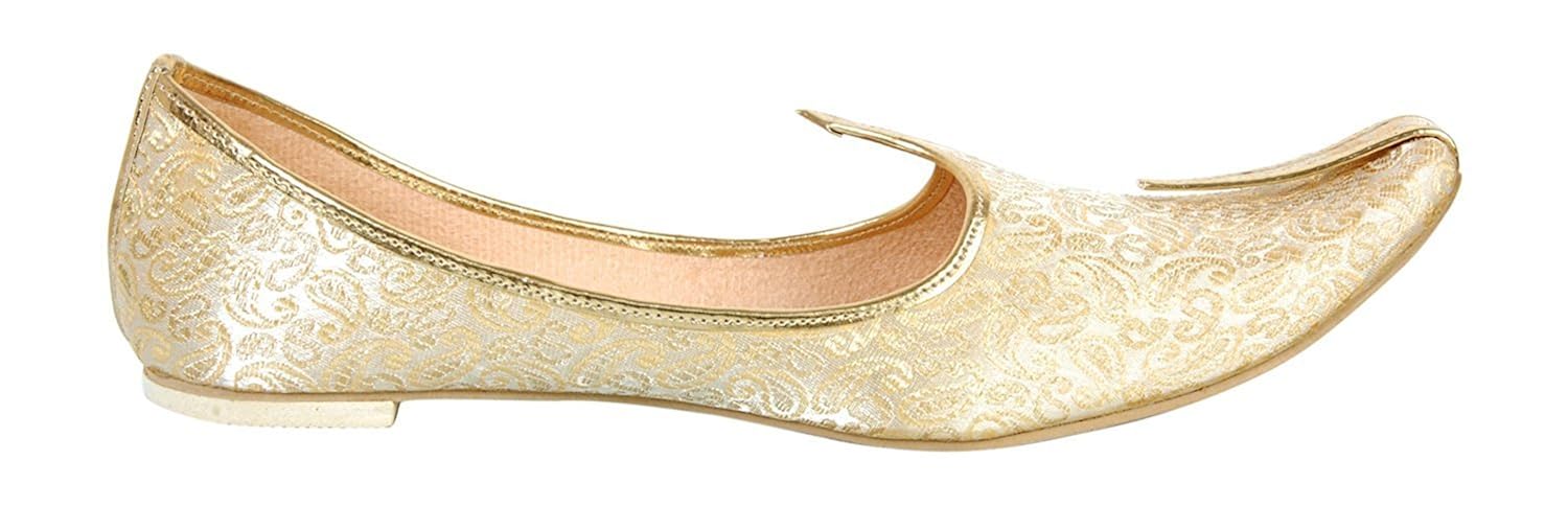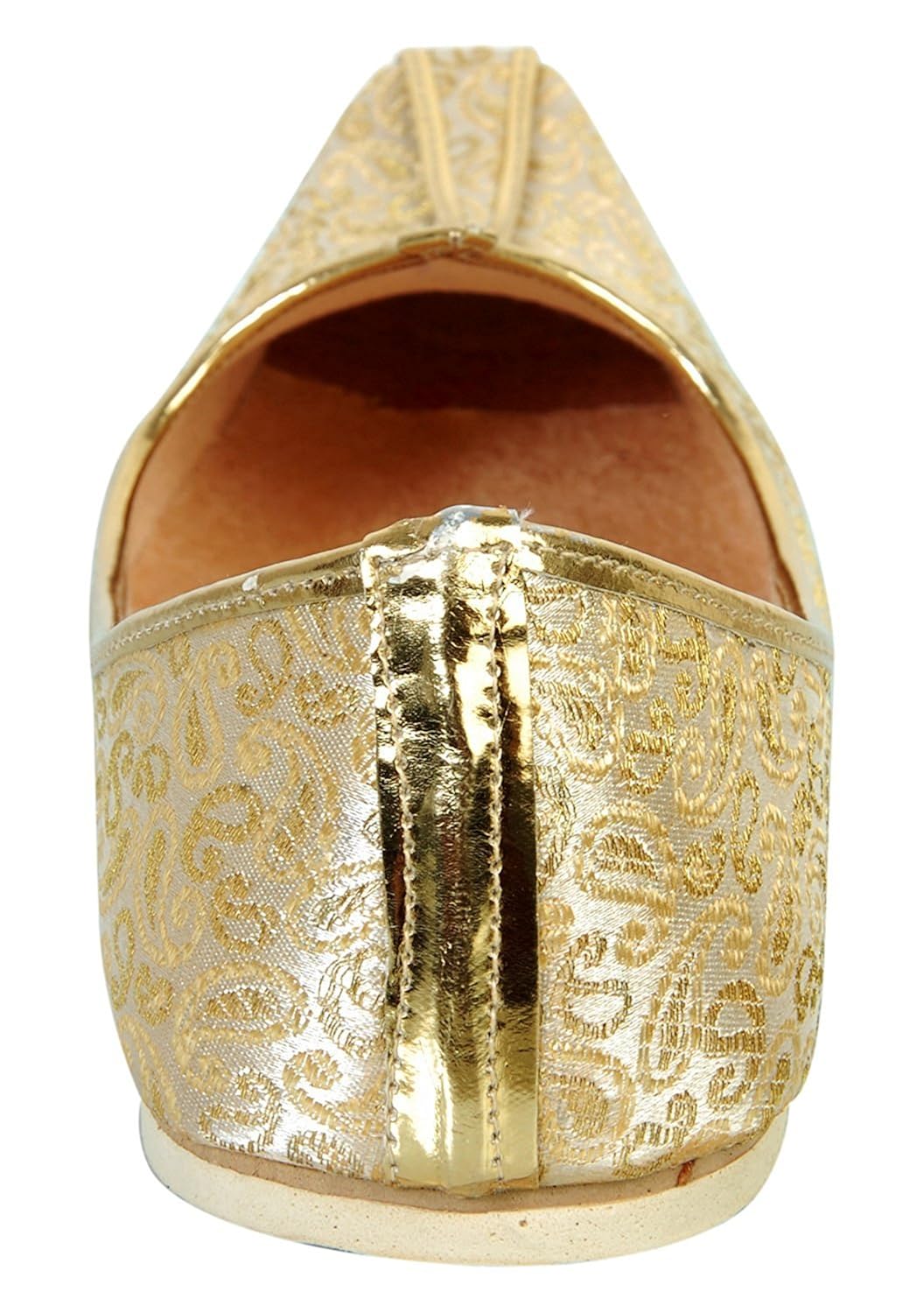 This product is made from synthetic material on the inside and outside and is finished in an attractive gold color. It features rubber sole, slip on closure, and are designed to be used as traditional wear footwear. Furthermore, it is recommended to be kept away from extreme heat and corrosive liquids to avoid damage. |