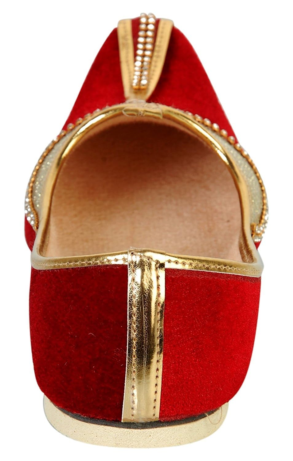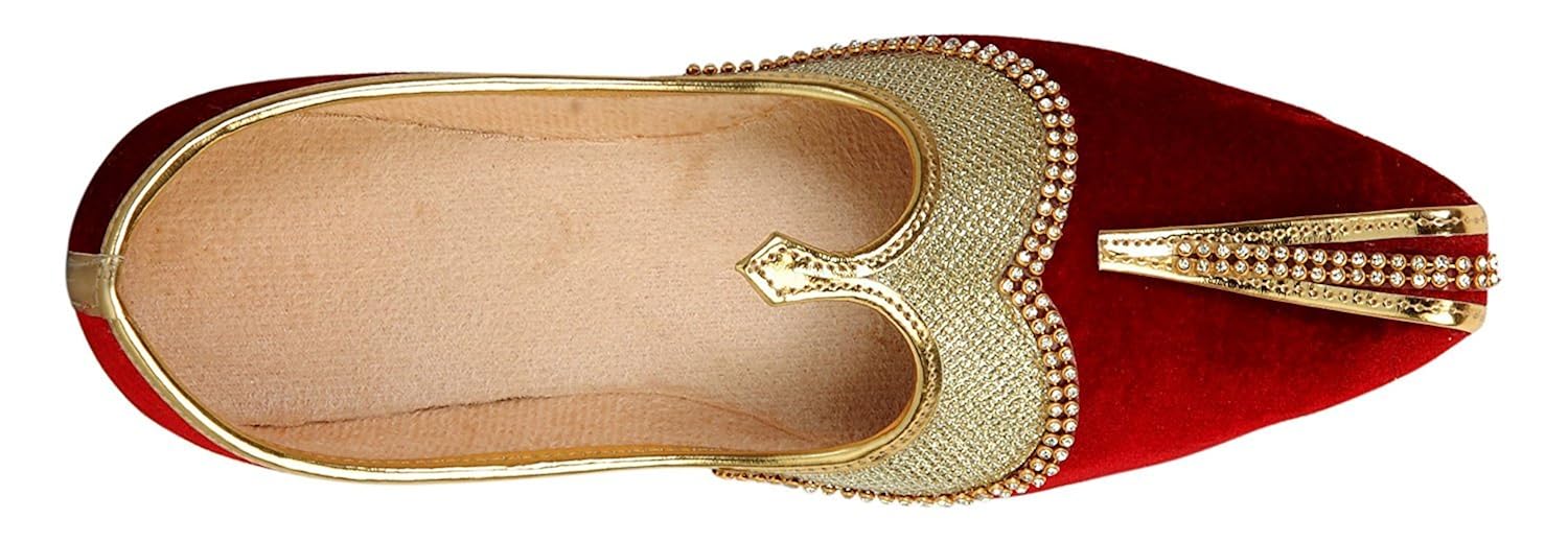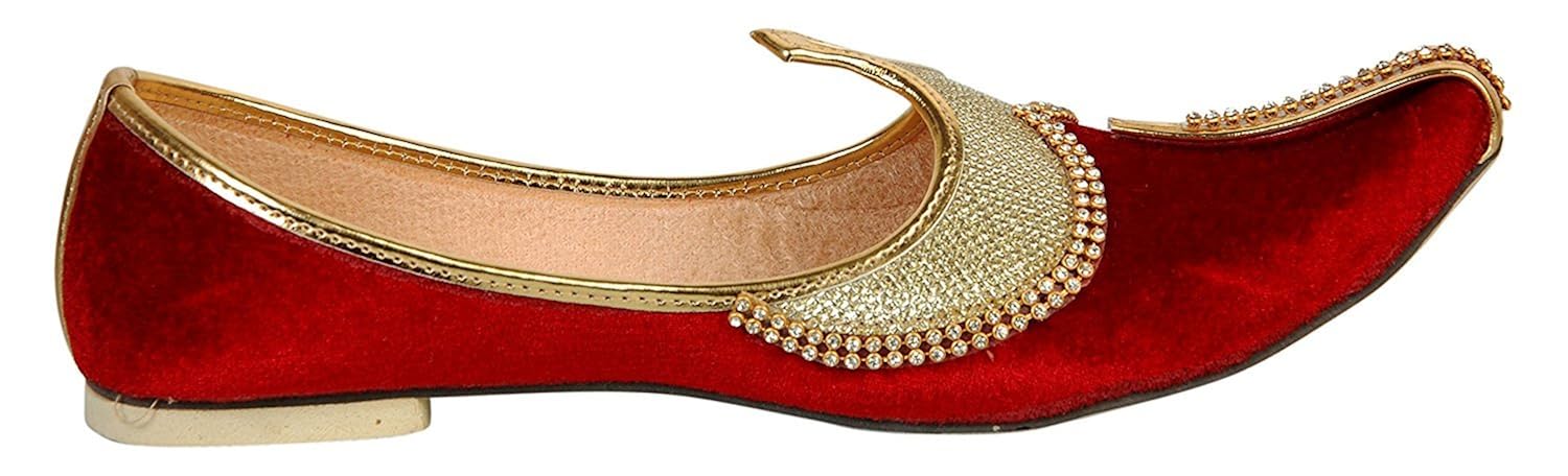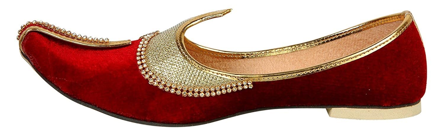 This product is made from velvet on the outside and synthetic material on the inside and is finished in an attractive red color. It features rubber sole, slip on closure, and are designed to be used as traditional wear footwear. Furthermore, it is recommended to be kept away from extreme heat and corrosive liquids to avoid damage. |