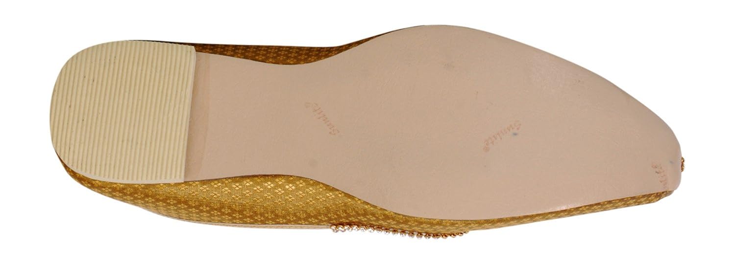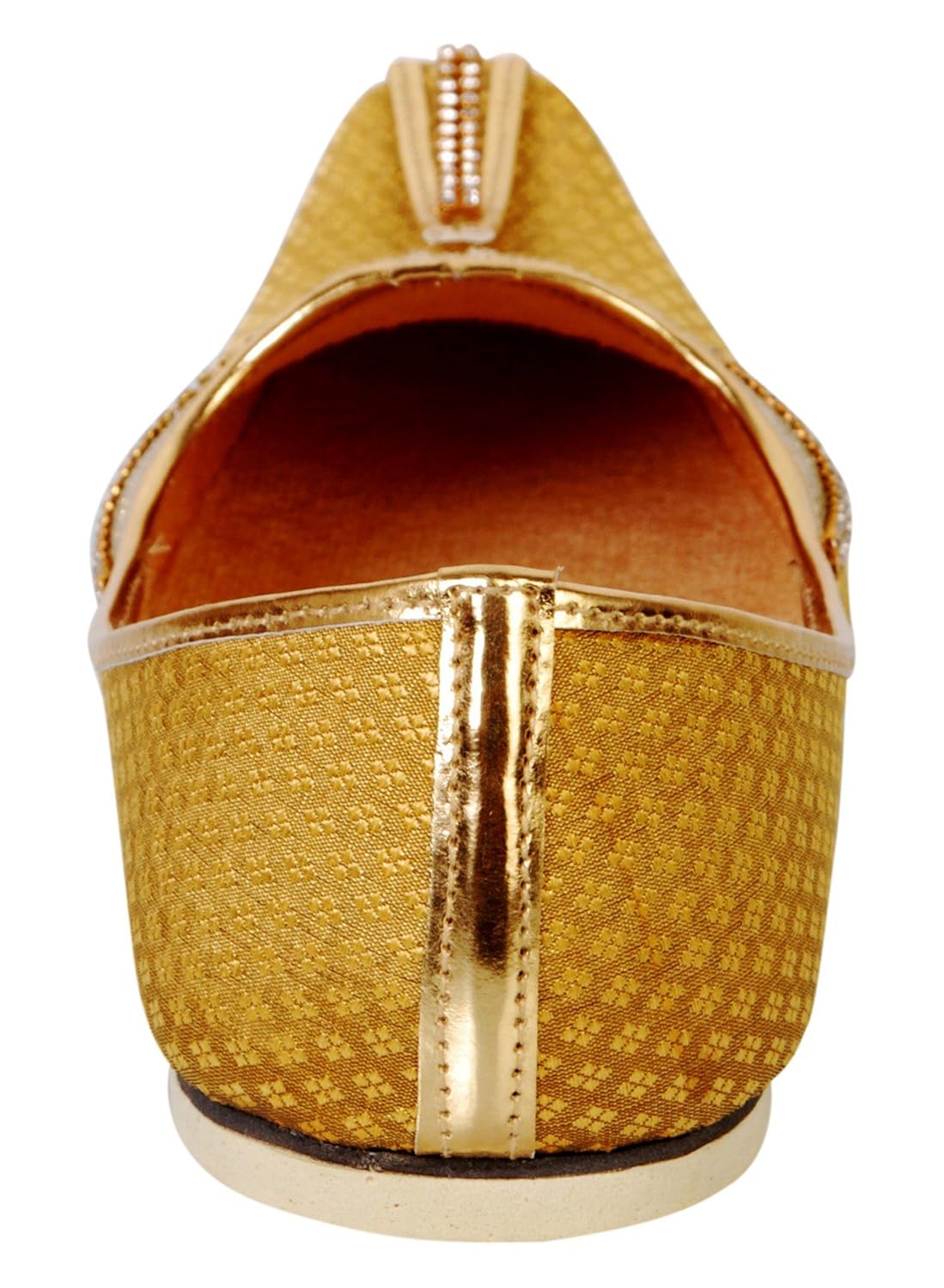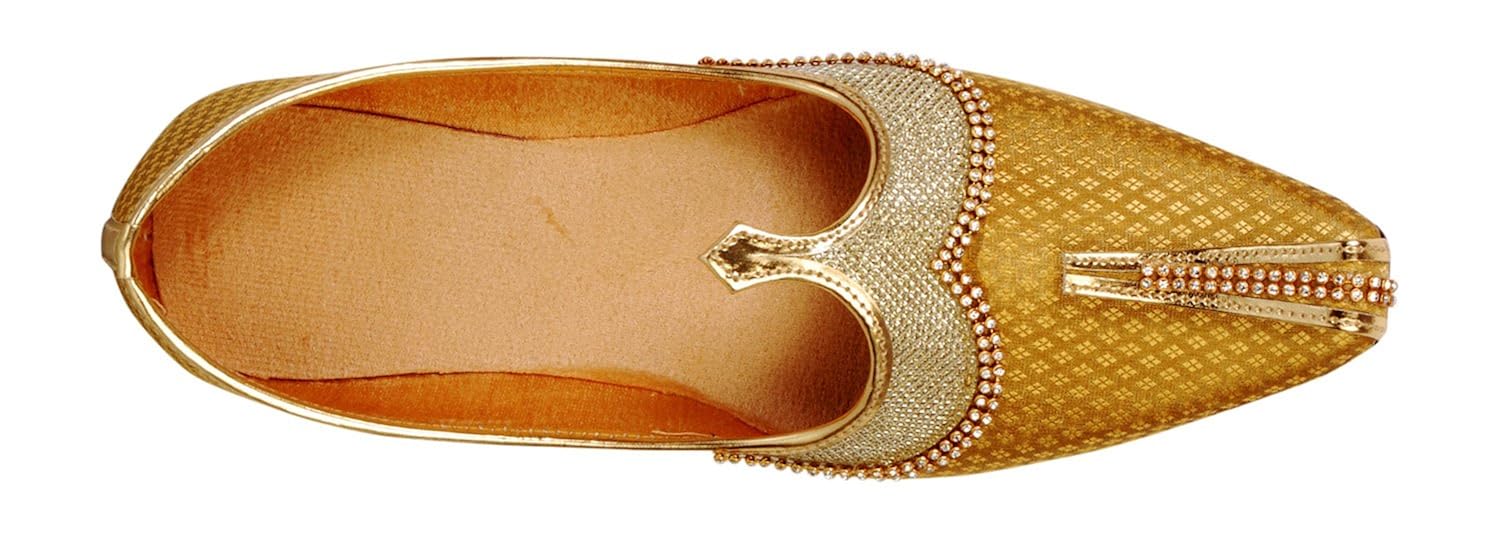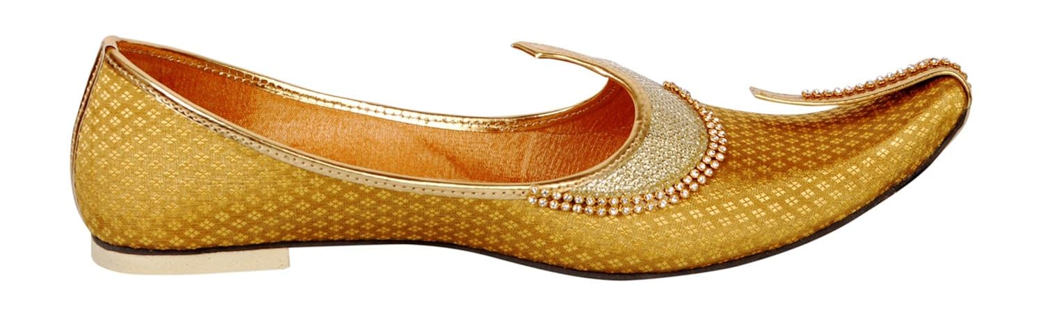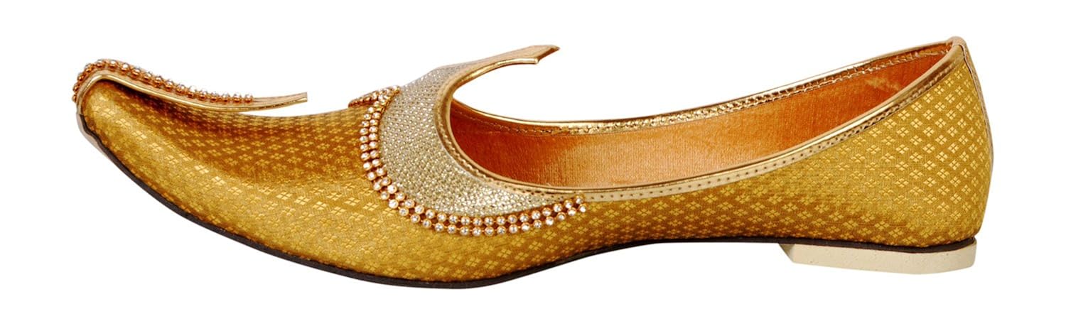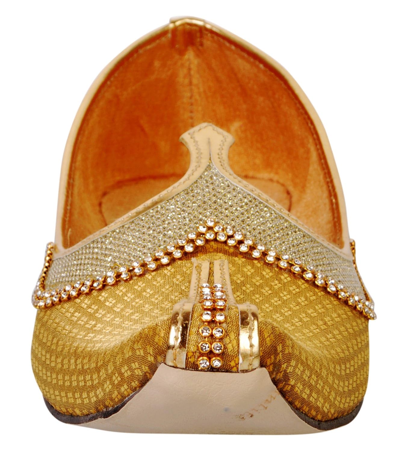 This product is made from synthetic material on the inside and outside and is finished in an attractive gold color. It features rubber sole, slip on closure, and are designed to be used as traditional wear footwear. Furthermore, it is recommended to be kept away from extreme heat and corrosive liquids to avoid damage. |