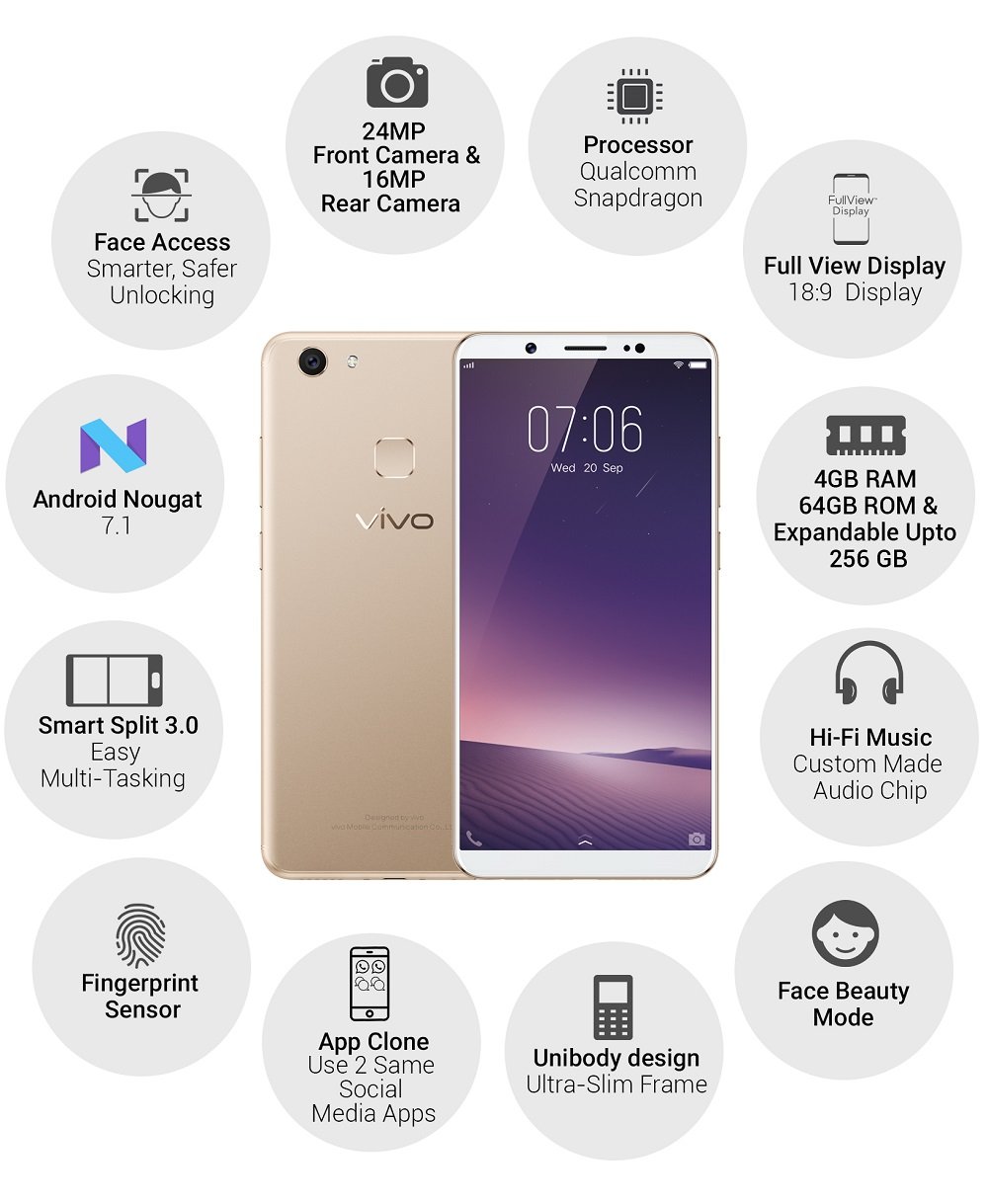 Android v7.1 Nougat Funtouch 3.2 operating system with 1.8GHz Qualcomm Snapdragon 450 octa core processor, Adreno 506 GPU, 4GB RAM, 64GB internal memory expandable up to 256GB and dual SIM (nano+nano) dual-standby (4G+4G)