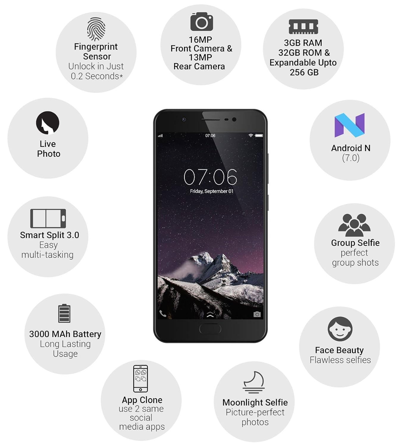Android v7 Nougat operating system with 1.5GHz Mediatek MT6750 octa core processor, ARM MaIi T860 MP2 GPU, 3GB RAM, 32GB internal memory expandable up to 256GB and dual SIM (nano+nano) dual-standby (4G+4G) |