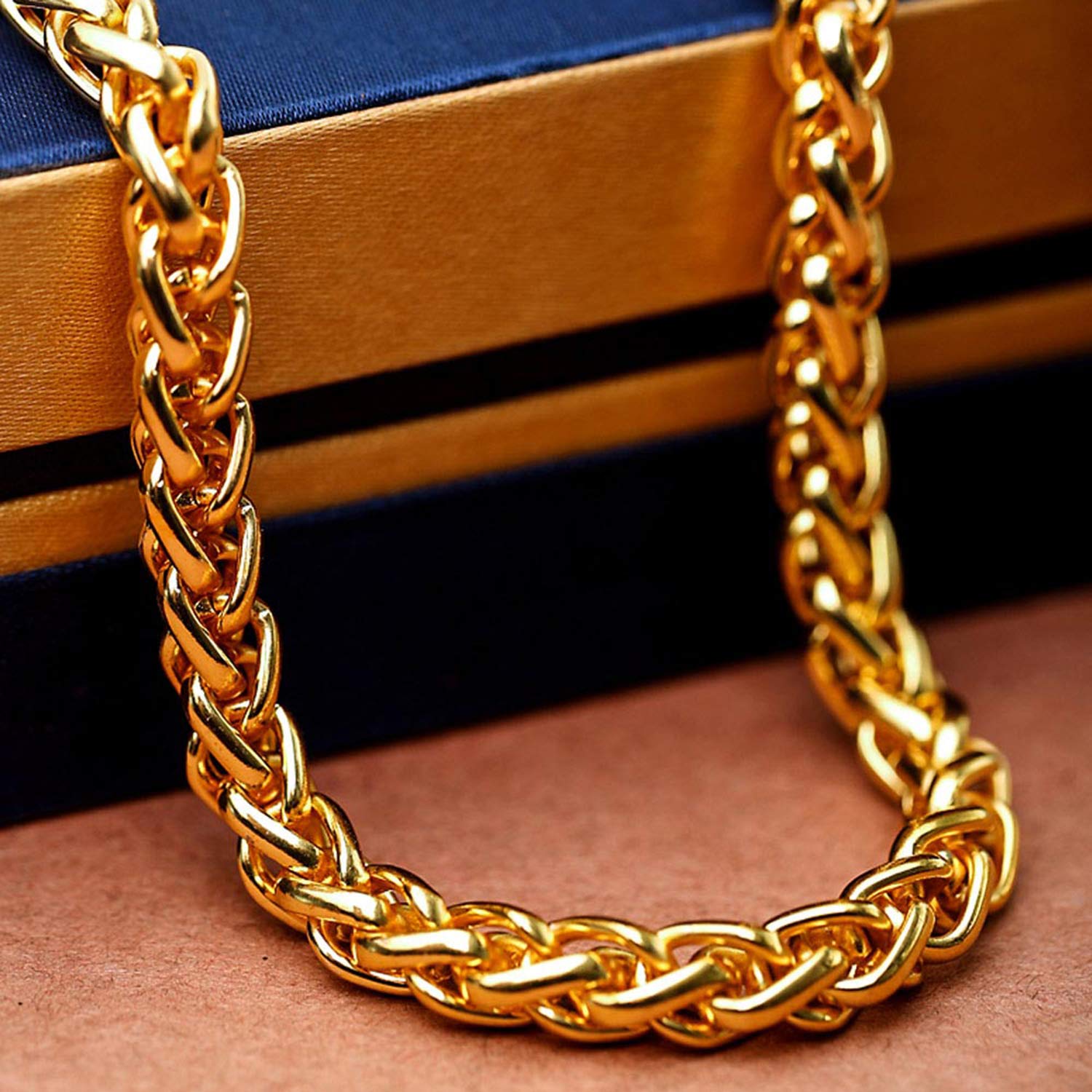Men's brass chain with rope link design and yellow gold plating. Lightweight and a perfect match for formal ethnic attire. To make your accessories last longer avoid harsh chemicals and moisture. Keep dry, clean with dry cloth and wear with panache. "India's largest fashion jewelry brand DARE, comes from the House of Voylla as a limited edition of handcrafted accessories for the modern Indian men. |