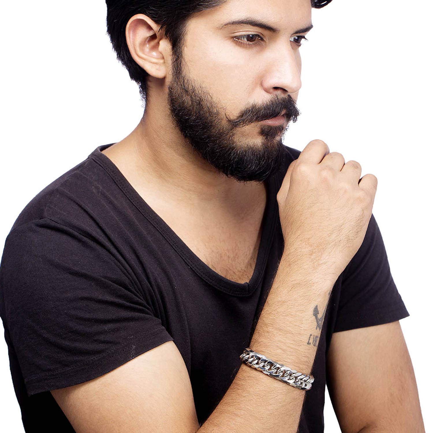 Designed to be rugged and solid, this stylish bracelet has been fashioned out of tough stainless steel. With a striking silver plating, the fashionable accessory has been designed to be a head turner. Comfortable lobster claw clasp keep the bracelet safely in place while you're out being awesome. To make your accessories last longer avoid harsh chemicals and moisture. Keep dry, clean with dry cloth and wear with panache. From the house of Voylla , India 's largest fashion jewelry brand comes dare, a line of handcrafted accessories for the modern India n man. |