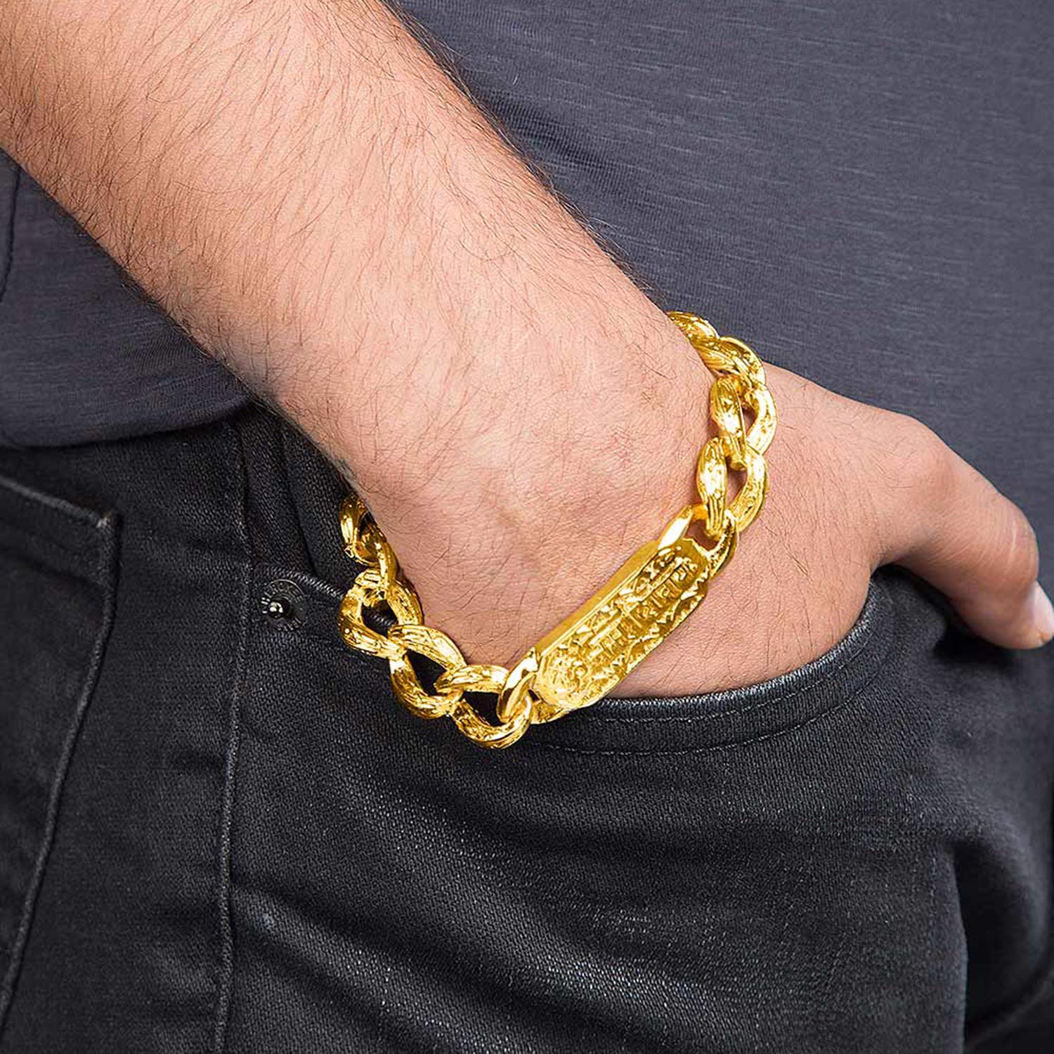 This stylish bracelet from DARE by Voylla is a smart way to jazz up your outfit with just the right hint of yellow gold tone and trendy durable brass. The bracelet is understated. Our stylists say this fashion accessory is for all you smart dressers who love making bold statements. Unleash your cool macho style with this designer Link Chain bracelet that makes your hairy wrists look more masculine and dashing! Team it with a cool black shirt and rock the party in style!To make your accessories last longer avoid harsh chemicals and moisture. Keep dry, clean with dry cloth and wear with panache."From the House of Voylla, India's largest fashion jewelry brand comes DARE, a line of handcrafted accessories for the modern Indian man. |