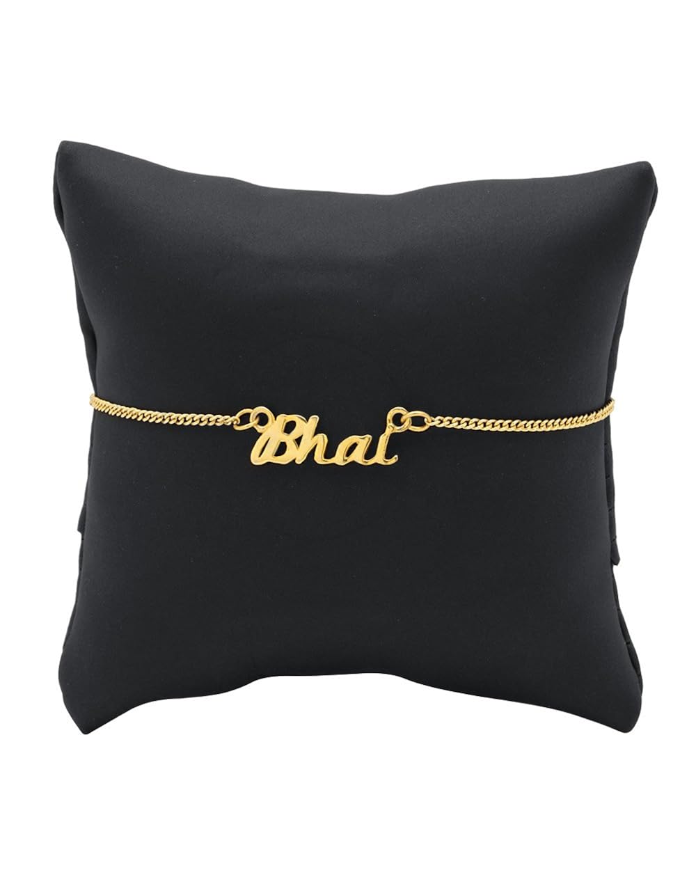 We bring to you a wide range of products in kundan, traditional, gold plated jewellery, American Diamond jewellery and other Jewelry accessories. Adorn you jewellery box with Voylla's designer Jewellery and shine every time you wear them. Give your brother the ultimate symbol of your love and affection with this attractive gold-toned bracelet rakhi featuring the word 'bhai'. Exquisitely crafted from brass and 3% silver alloy, this piece can be worn long after the festivities are over and will be a timeless treasure. Get it today. This piece of jewelry comes with the Voylla assurance of quality and durability. Caring for your fashion jewelry: We, at Voylla, take care of every piece of jewelry so that you don't spend hours caring for them. But do remember, fashion jewelry lasts longer when kept dry and free of chemicals. Follow this simple rule: Your jewelry should be the last thing you put on and the first thing you take off. |