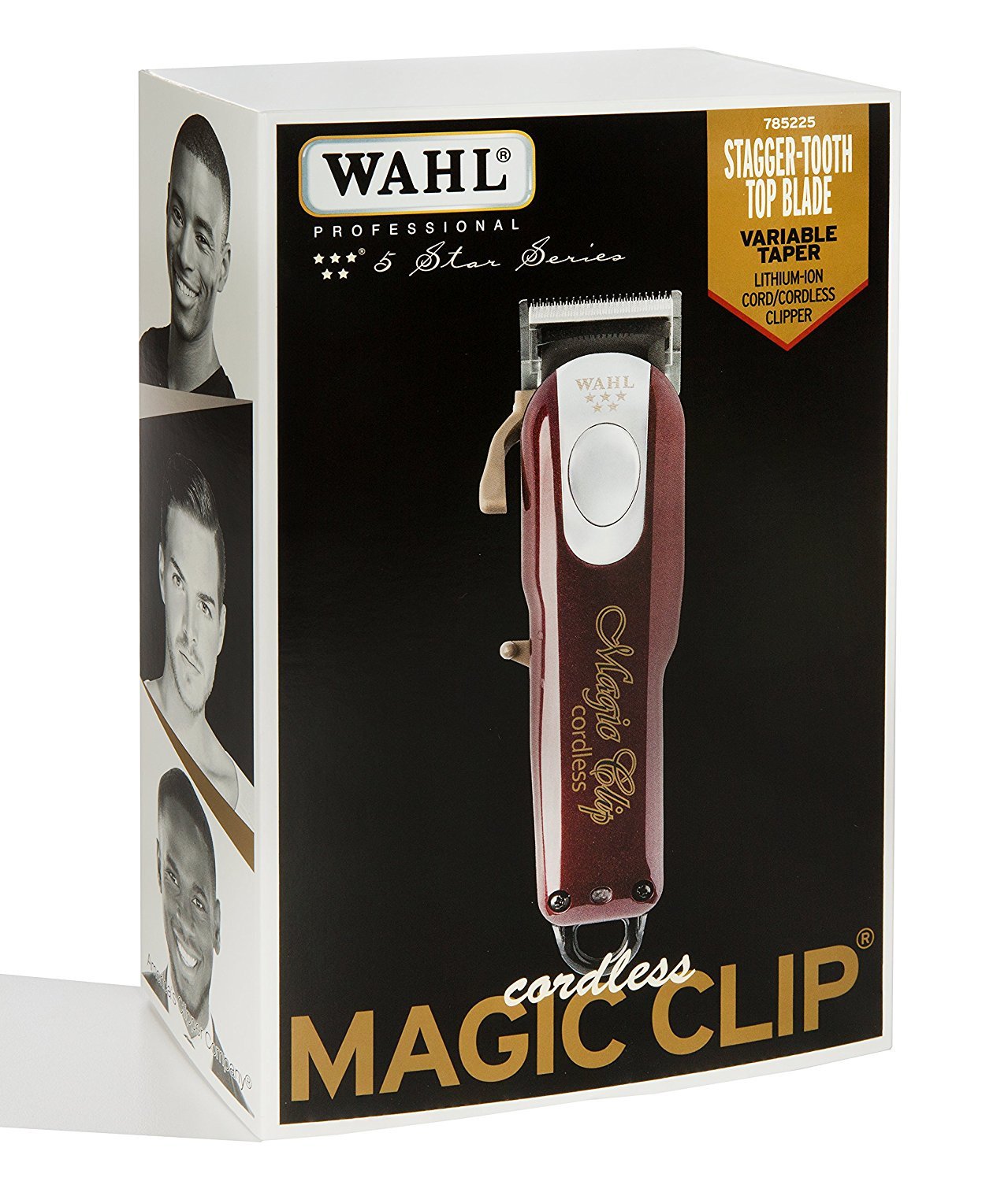 PROFESSIONAL PRECISION: From Wahl Professional's commercial grade line of products, the 5-Star Cord/Cordless Magic Clip is intended for professional use only and is designed to deliver the sharp performance that experts demand with the freedom of a cordless clipper. STYLISH AND FUNCTIONAL: The Magic Clip is the ultimate cordless clipper. It features high precision zero-overlap 2161 blades that offer superior speed and ease of use, a convenient taper lever for easy fading and blending, and a lithium ion battery for a 90+ minute run time per charge. Cord/cordless cutting capability. ACCESSORIES INCLUDED: For your convenience, the 5-Star Cordless Magic Clip comes with all accessories required for use. Package includes the clipper, (8) attachment combs, oil, cleaning brush, instructions, red blade guard, and recharging transformer. PRODUCT SPECIFICATIONS: The 5-Star Cord/Cordless Magic Clip (#8148) measures 6.25" long and weighs 10 oz. PLEASE NOTE: Wahl Professional Products purchased from this authorized dealer feature a manufacturer's warranty, which is not available from unauthorized dealers |