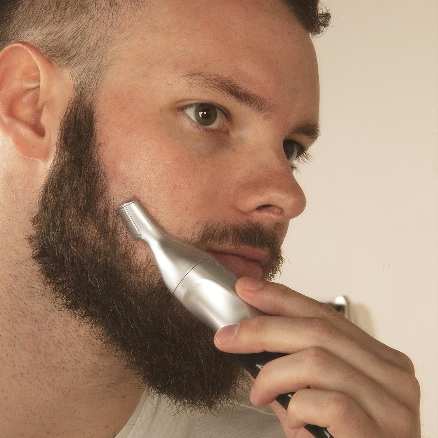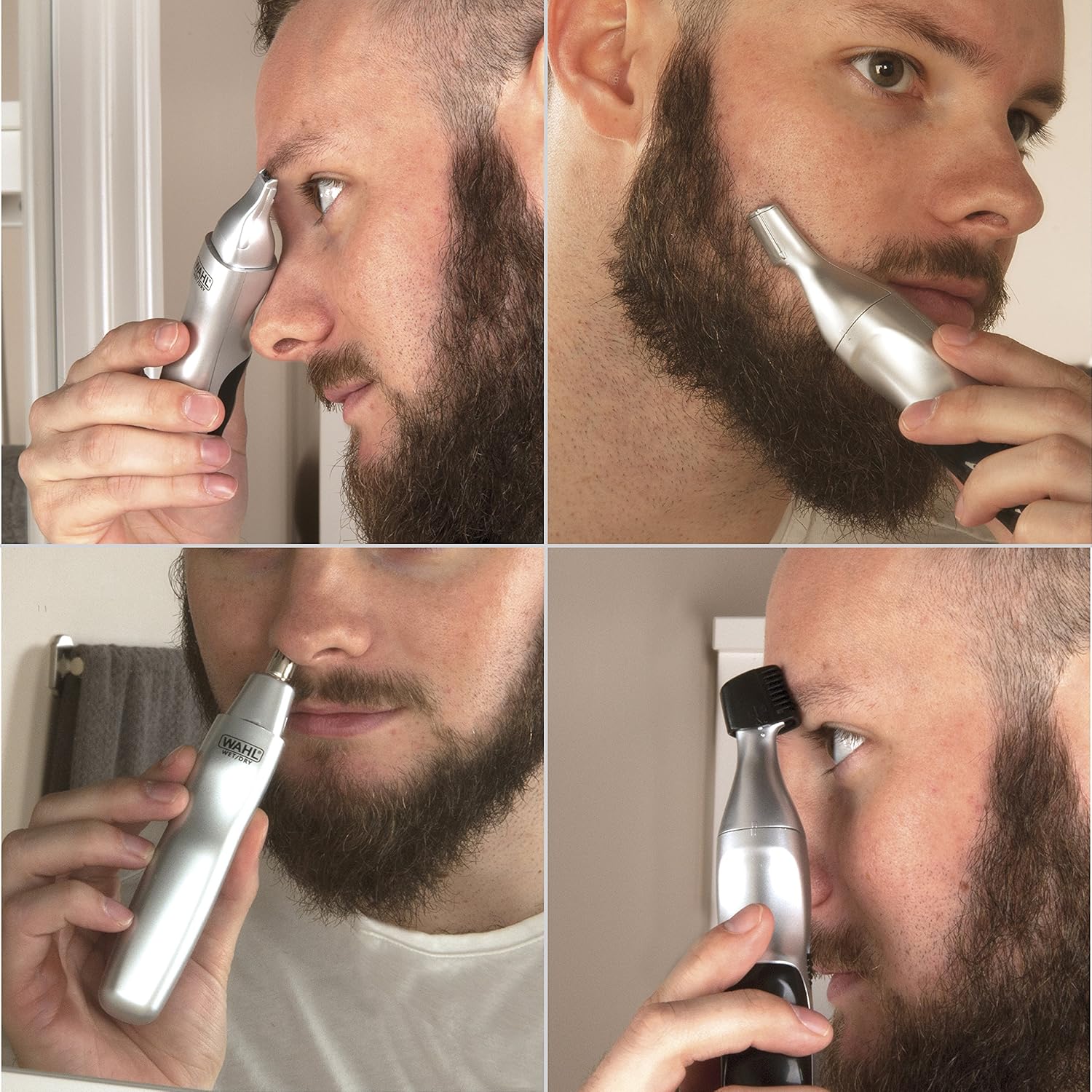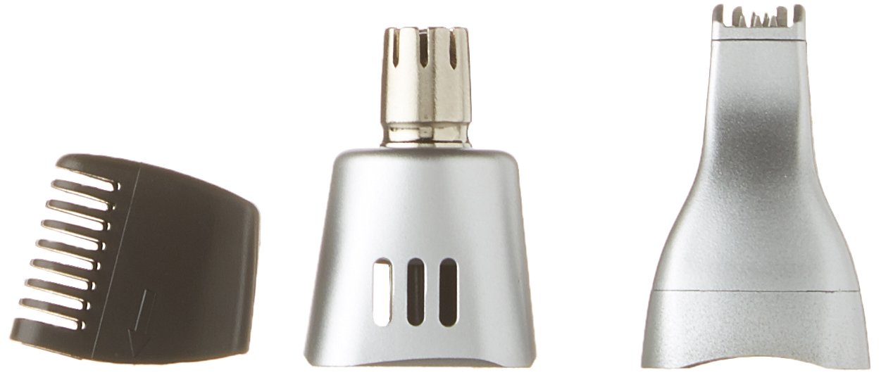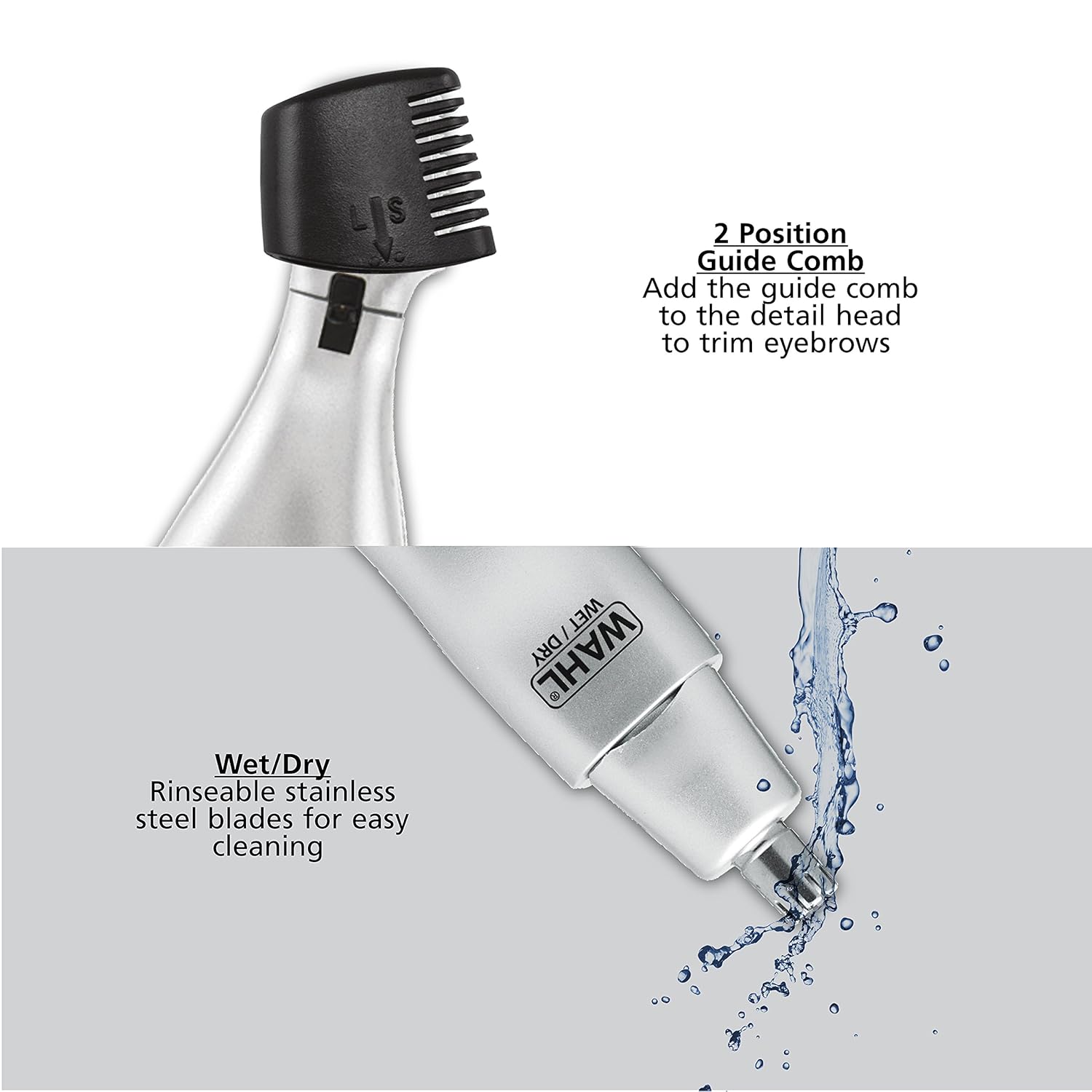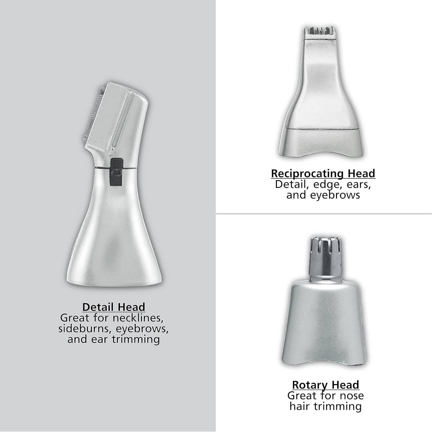 The ear nose brow - 3 in 1 trimmer (rotary, pen, and reciprocating) is battery operated and includes an eyebrow guide comb, protective cap, wet dry, silver, and english/spanish instructions. |