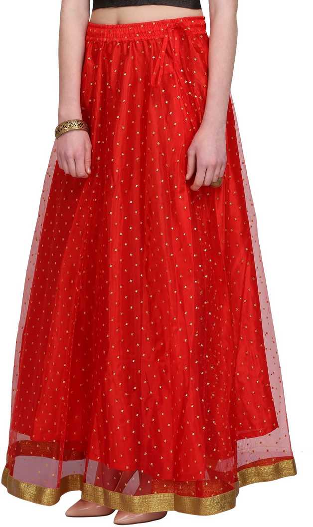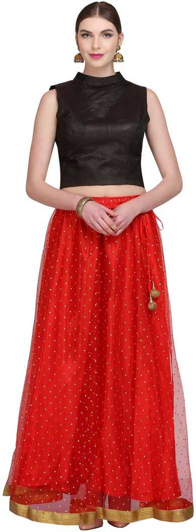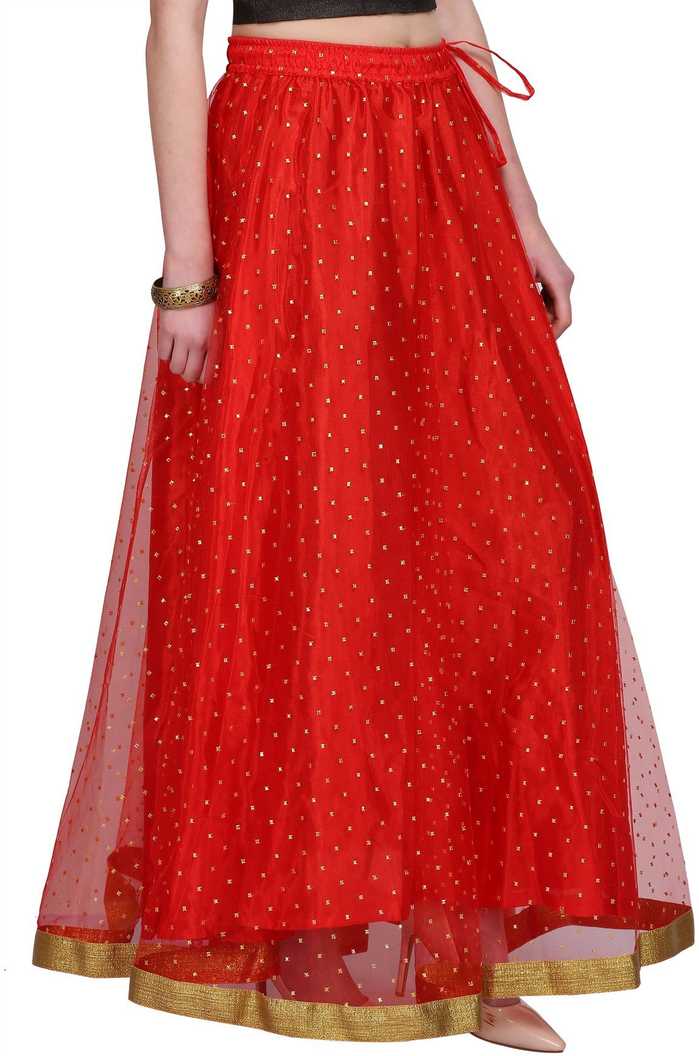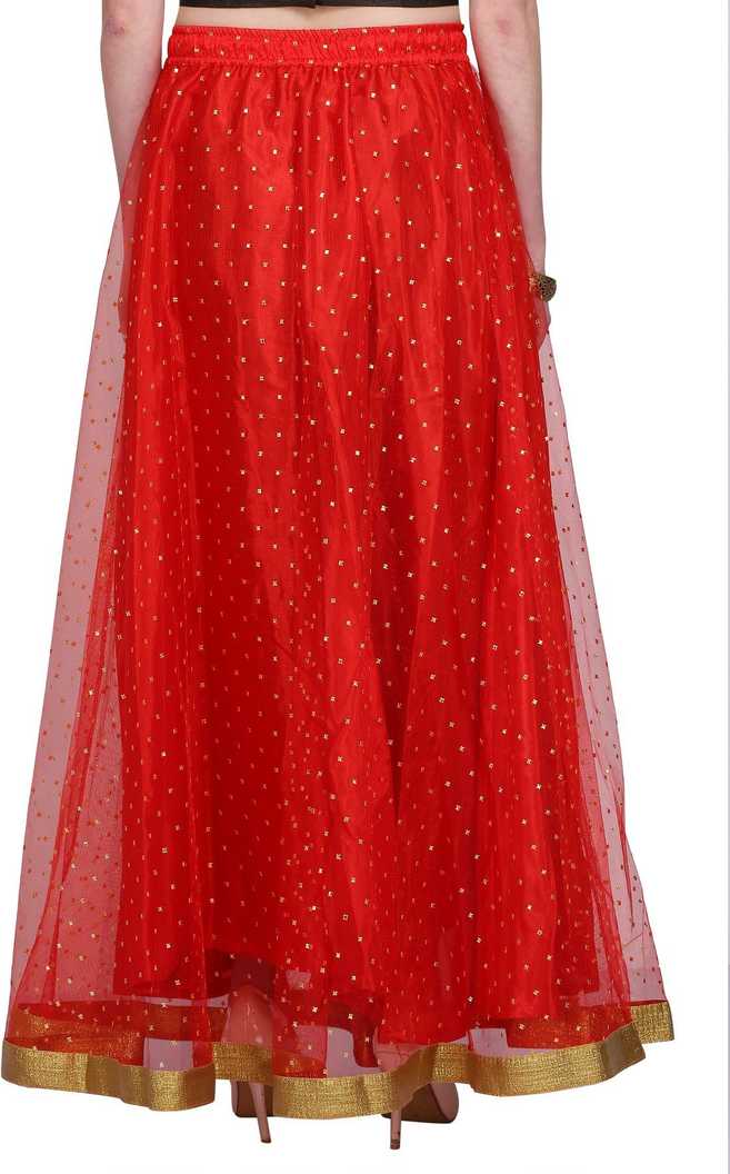 Long Skirt with big ghera that can be paired with a blouse and dupatta or a kurta or a top., Material- Net, Lining Material- Cotton, Sizing Info- Fits waist size 26 inches to 38 inches, Skirt length- 40 inches, Skirt Flare - 4.5 Meters, Occassion- Wedding/Evening/Party, Care Instructions- Dry Clean Only |