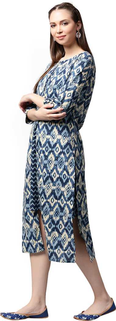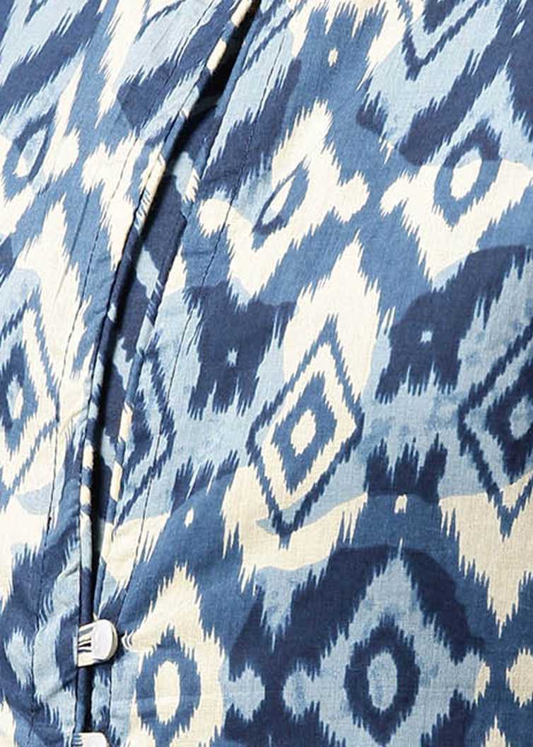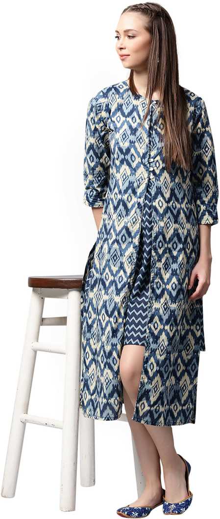 Print or Pattern Type :- Ethnic MotifsLength :- Maxi,,,,,,,Knit or Woven :- WovenPattern :- PrintedShape:-A-LineNeck:- Round NeckHemlineStraightSleeve Length : -Short SleevesFabric:-CottonStyle Description :Blue ikat Printed double Layered Dressseason:- Winter |