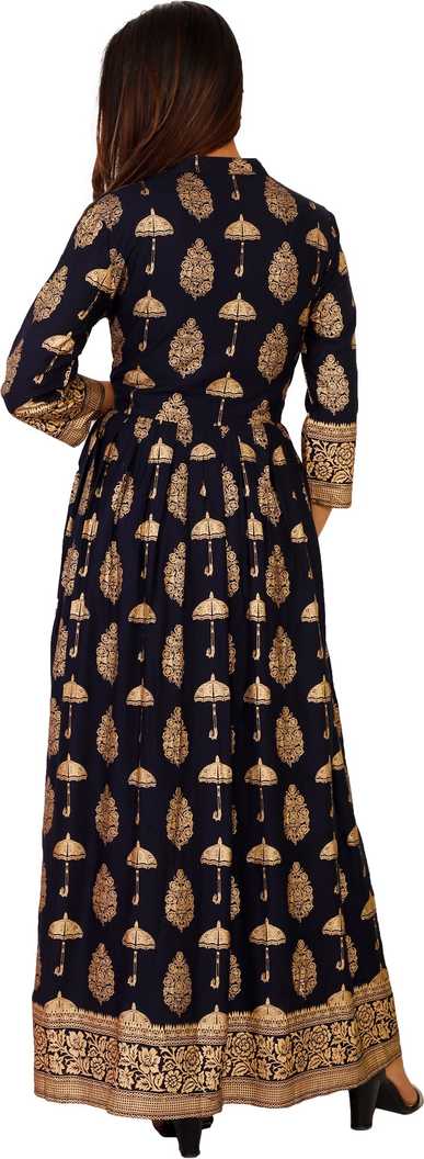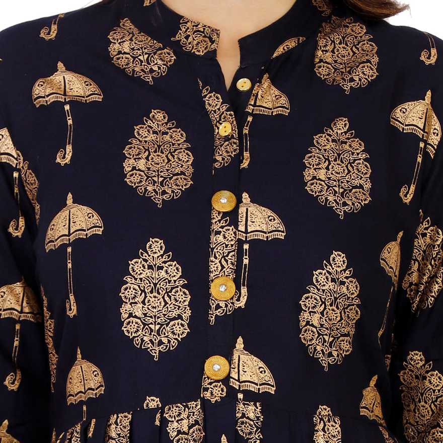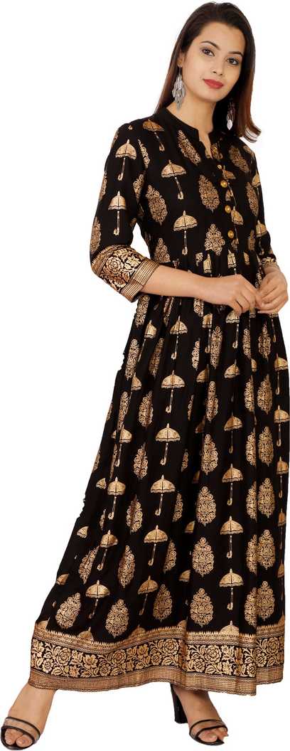 Fabric:-Rayon|Color:-Black|Pattern:-Printed|Type:-Flared |
