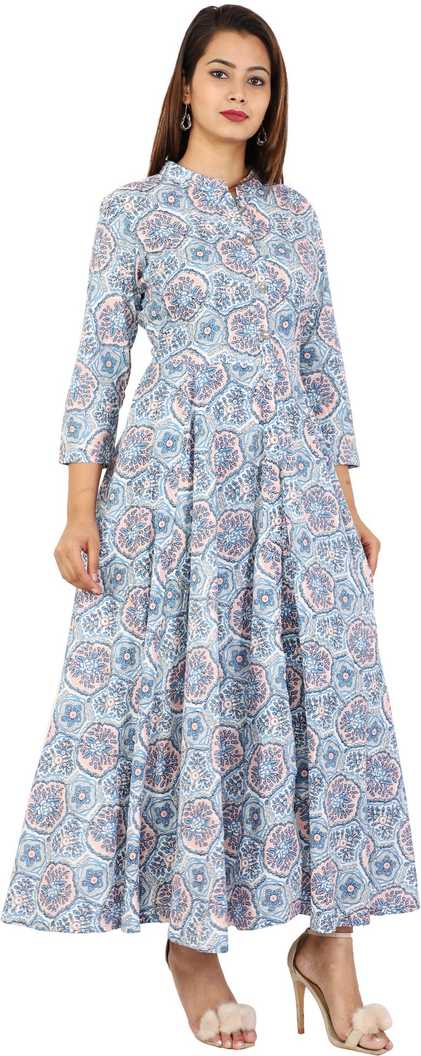 FABRIC:COTTON;; TYPE:FLARRED ANARKALI;; COLOR:SKY BLUE;; LENTH:53 INCHES;; SLEEVE:3/4 SLEEVE;; NECK:COLLAR |