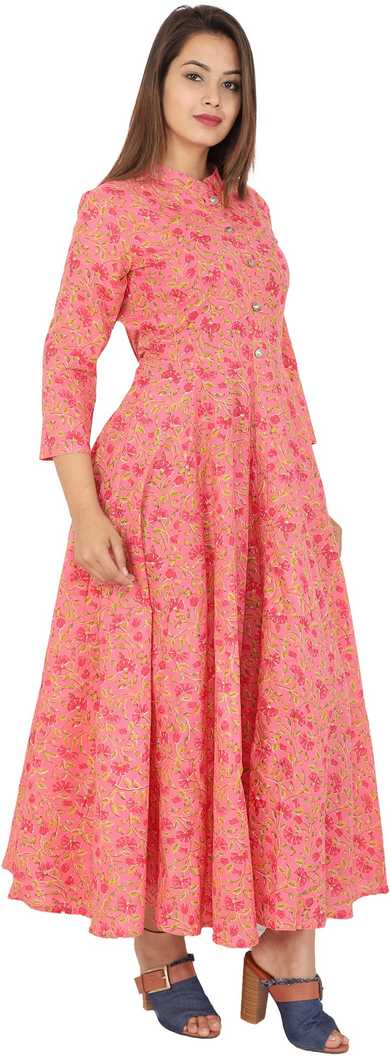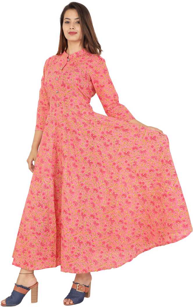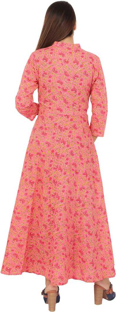 FABRIC:COTTON;; COLOR:PEACH;; WORK:PRINTED;; TYPE:FLARRED ANARKALI;; NECK:CHINESE COLLAR;; SLEEVE:3/4 SLEEVE;; LENTH:52 INCHES |