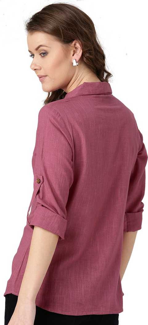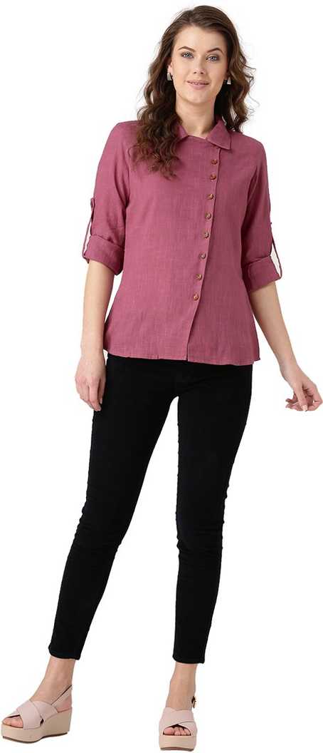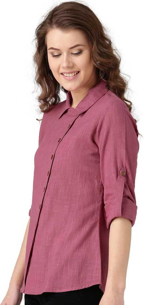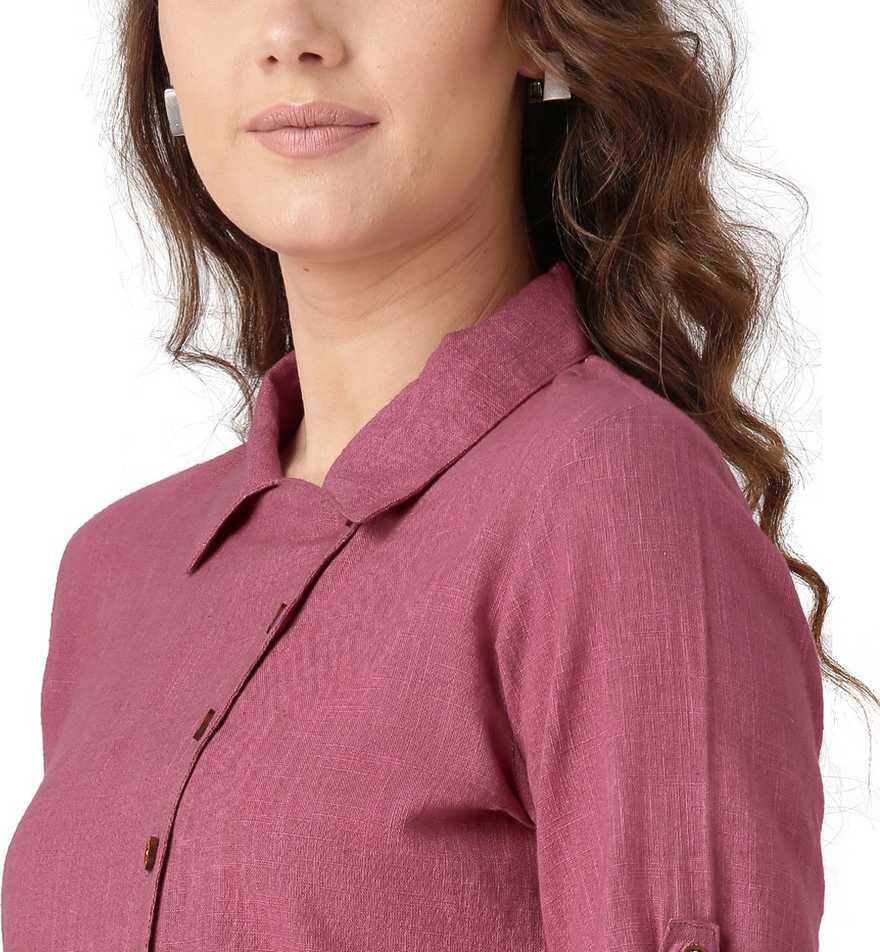 Other Details: Desi Fusion Women Pink Solid Front Placket Cotton Slub Shirt