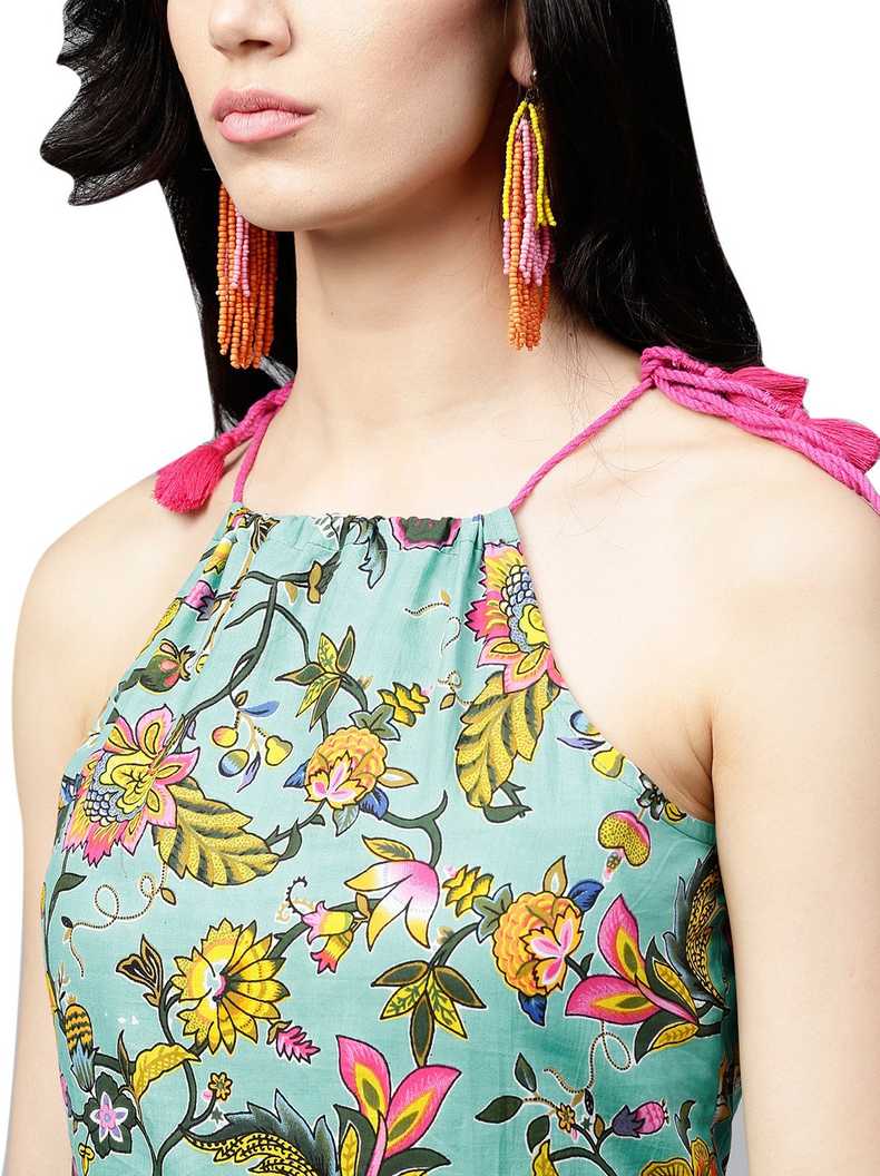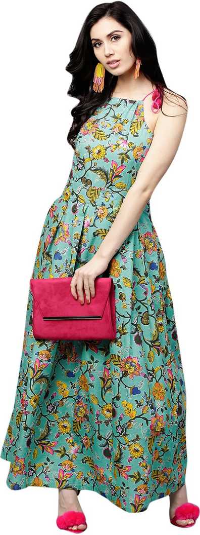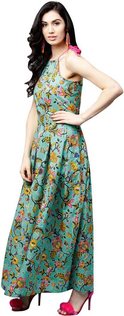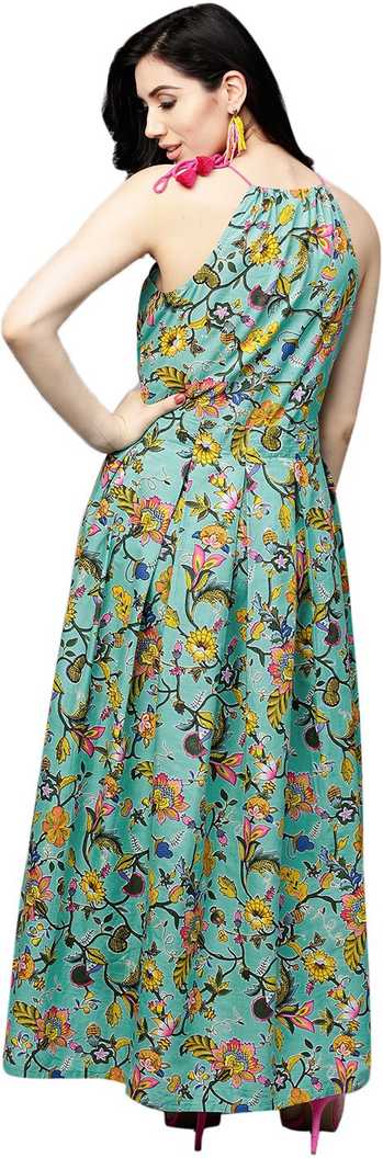 Other Details: Green & Yellow Printed box pleated Dress