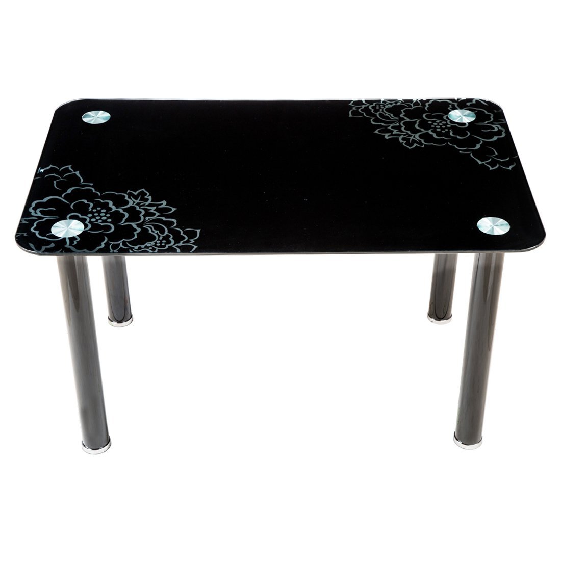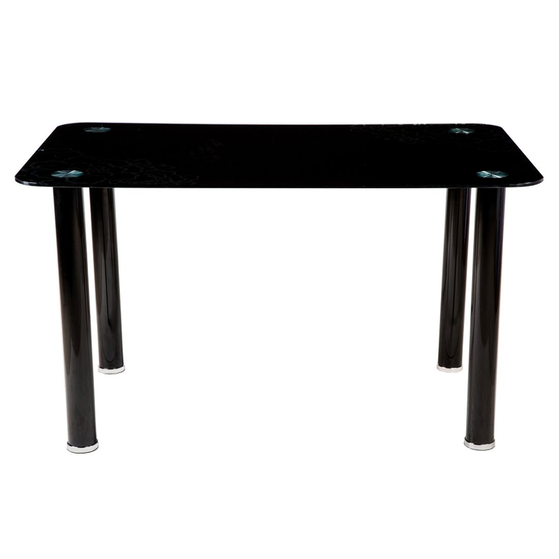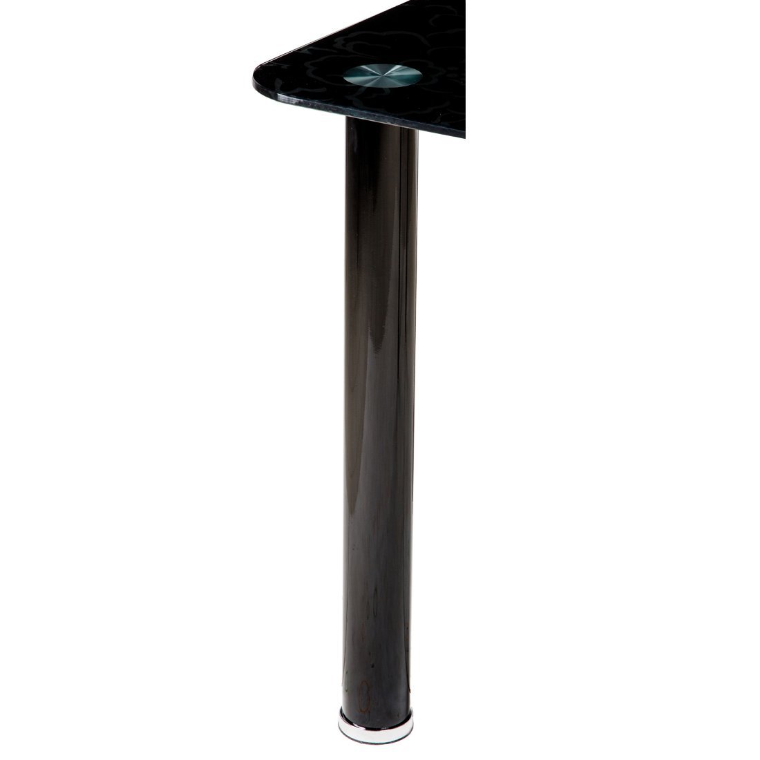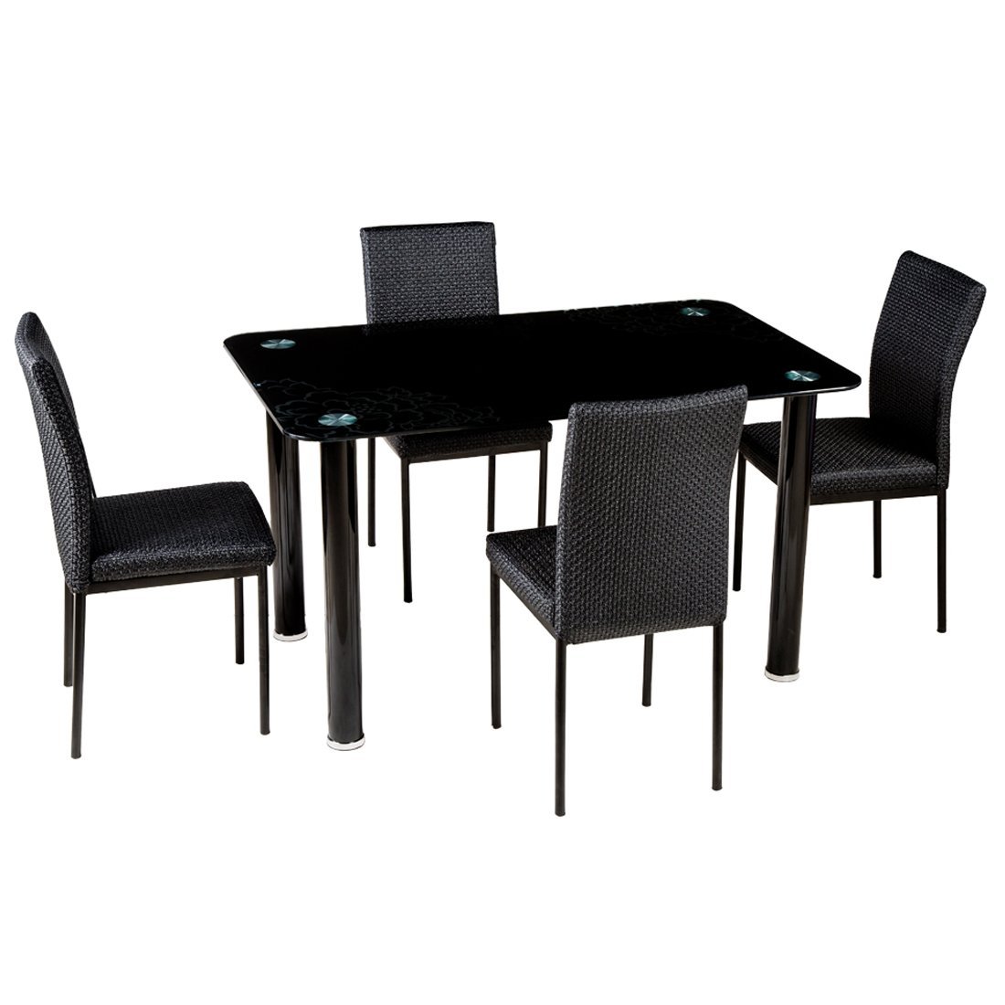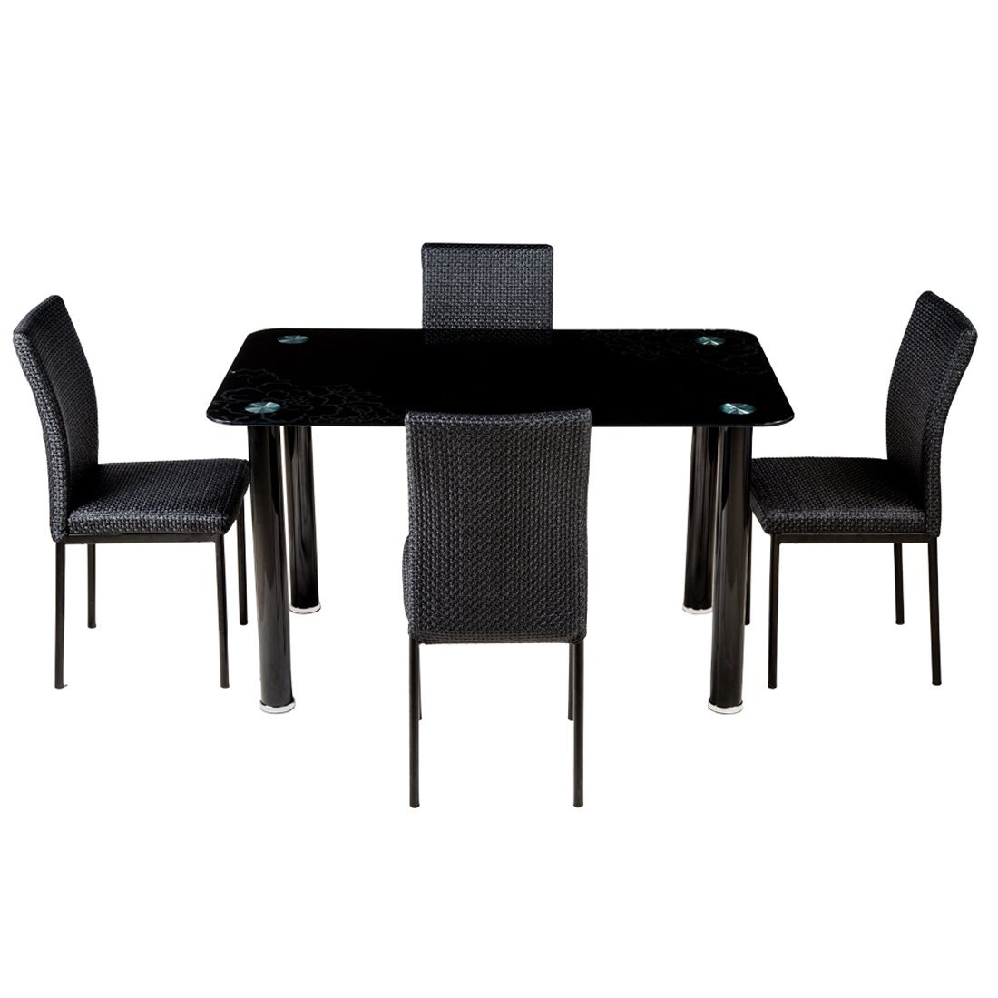 Dining set features graphic patterns and a metal and glass design to create a contemporary look