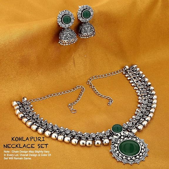 Classic silver oxidized Necklace set for women- a stylish contemporary latest antique vintage kolhapuri green stone Necklace Set with Jhumka Earrings stunning & preciously suitable fabulous match for all your special occasions,events & festivals.Our Product is perfect for valentines Anniversary Birthday gift for Women,girlfriend,Wife.