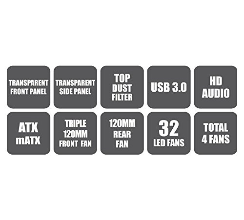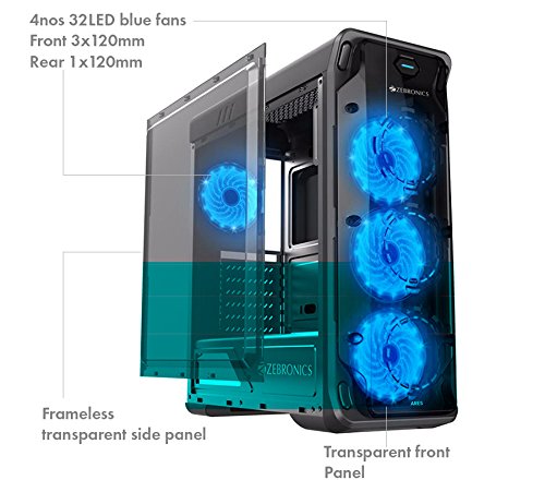 Ares is a gaming cabinet which has a ATX / mATX. It comes with HD audio and has triple 120MM front fans and 120MM rear fan. It comes with a USB 3.0 and has a transparent front panel along with Frameless transparent side panel. It has fans with 32 nos of Blue LED’s and has optimized design for airflow. It also Supports upto 380mm VGA comes with a top dust filter. |