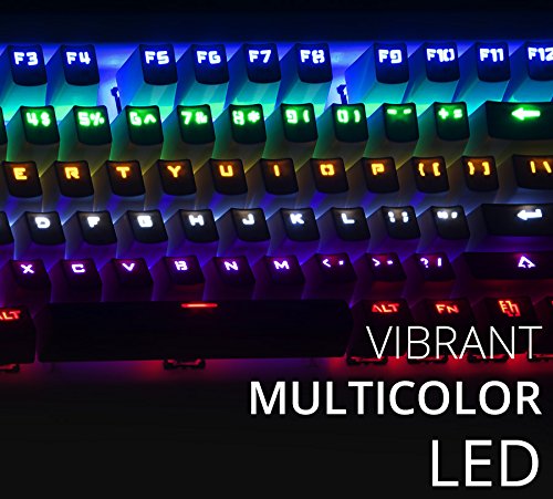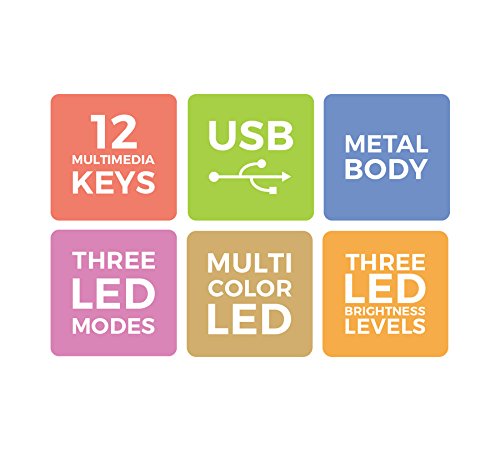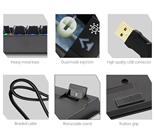 Premium mechanical keyboard with 3 LED modes and 3 brightness levels. Compact mechanical keyboard, comfortable switch tactile feeling, pre-programed LED modes, integrated media control, LED on/off switch, bottom rubber grip, heavy, metal body, retractable stand, braided cable. |