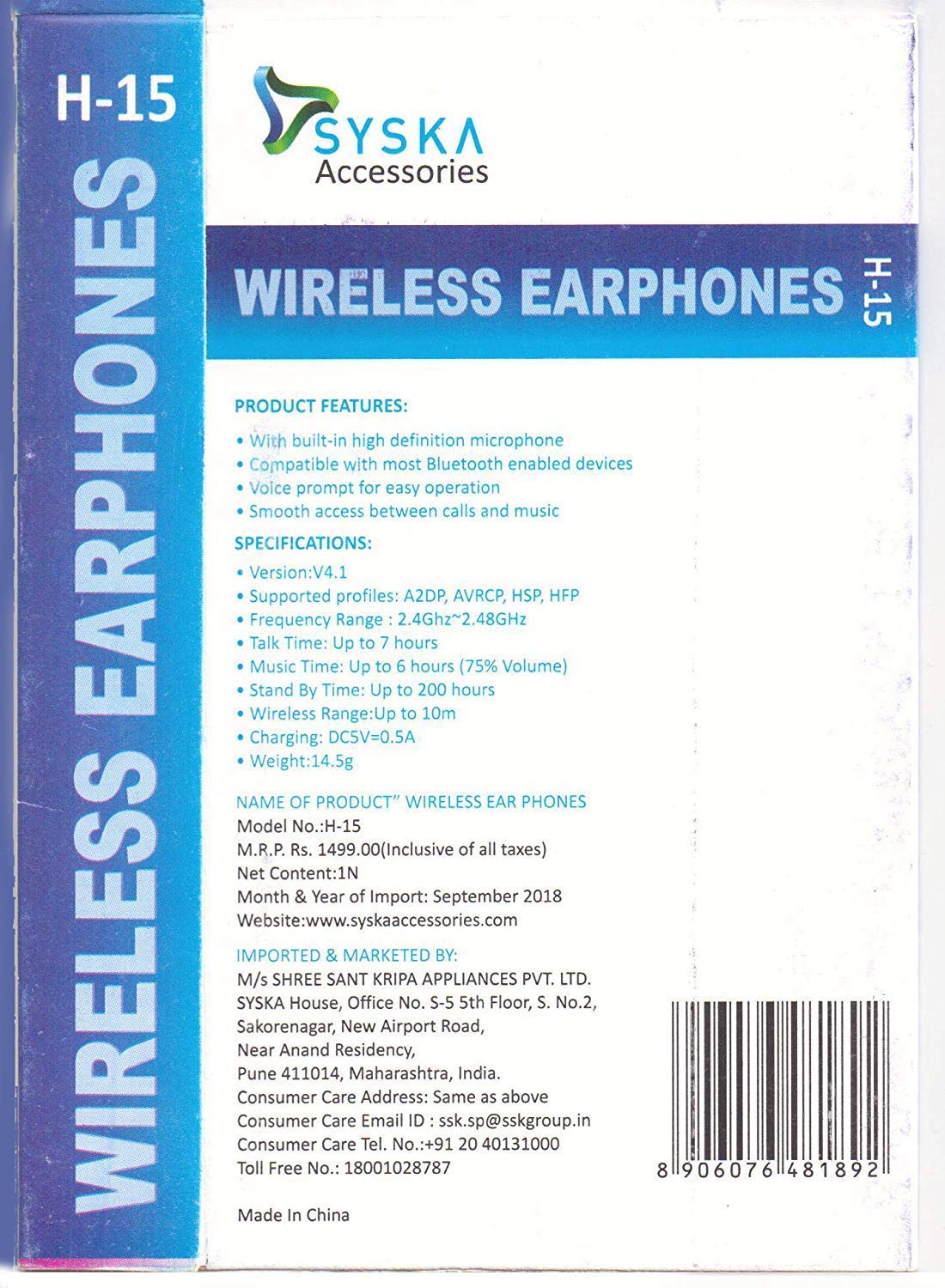 With built-in high definition microphone.Bluetooth Version: V4.1+EDR,Talk Time: Up to 7 hours.Wireless Range: Up to 10m